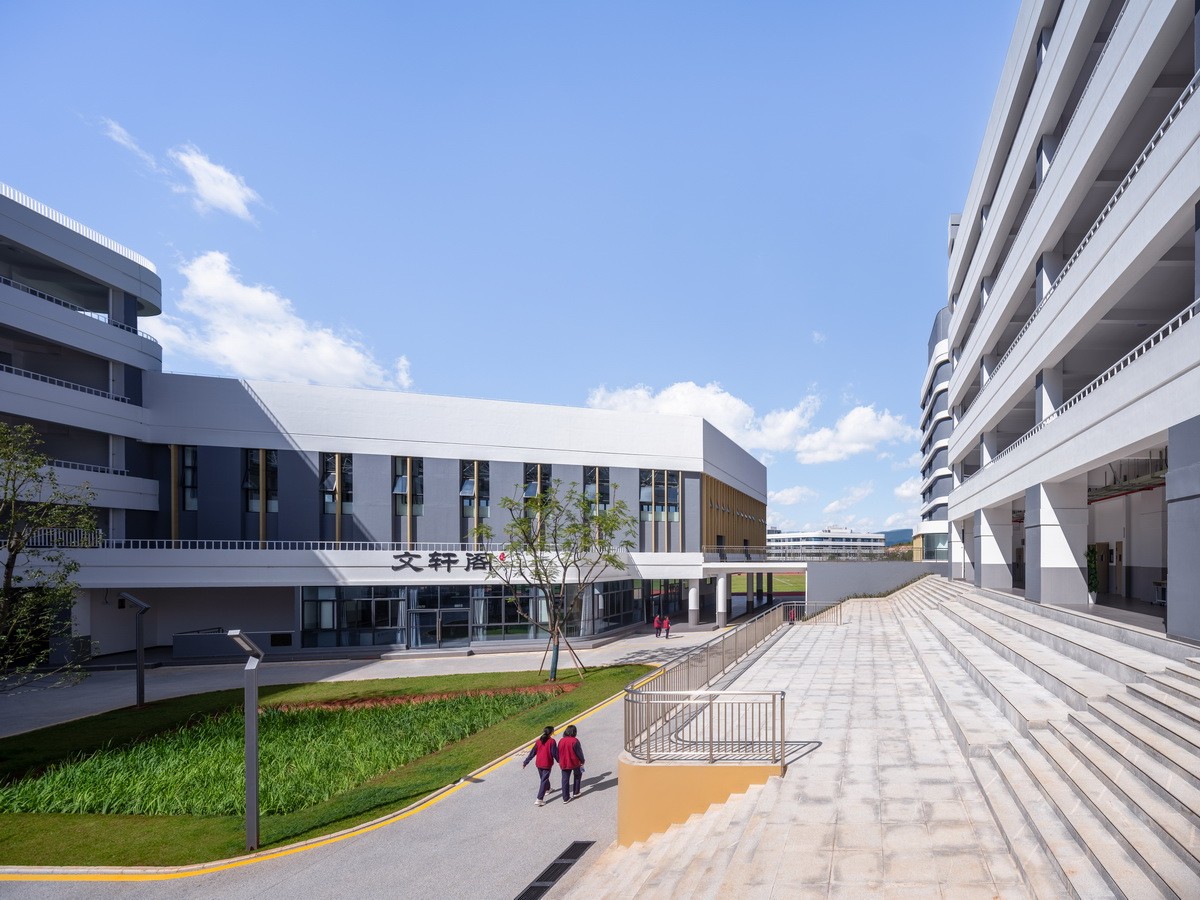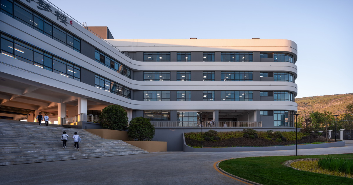 在山脉环绕中,一座建筑群如同白云般径盘在山畔,这便是云南省玉溪弘玉中学。校园与周围的环境融为一体,远观使人感受到云南特有的柔软之美;从学校的门口向里望去,一片欣欣向荣的生态绿意,仿佛是大自然对于知识的庇护。