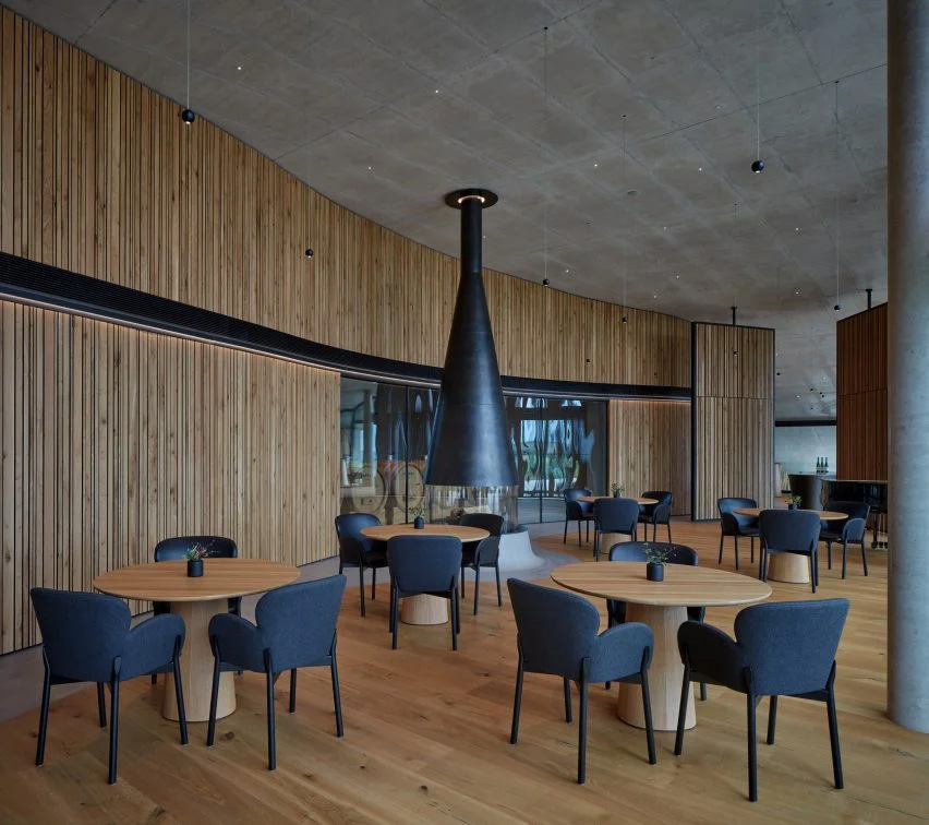 在酒厂内部,屋顶结构的混凝土暴露在外,形成了原始的天花板。这些与覆盖在接待室和品酒室墙壁上的木条形成对比,其中心设有混凝土和钢制壁炉。在公寓中,一张中央床位于木质覆盖的浴室后面,由一条弯曲的裸露混凝土隧道构成,形成墙壁和天花板。