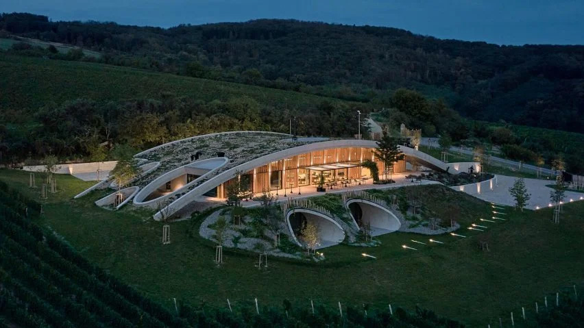 阿莱什菲亚拉工作室的建筑师阿莱什-菲亚拉(Ales Fiala)说:“景观环境以平缓的曲线形式呈现——景观中的波浪,山丘之间的山丘…我们非常小心地将建筑融入地形,并将其与文化和自然绿化联系起来。”他继续说道:“将建筑嵌入地形中,创造出一种欢迎的背景感,并与葡萄酒的产地自然融合。”