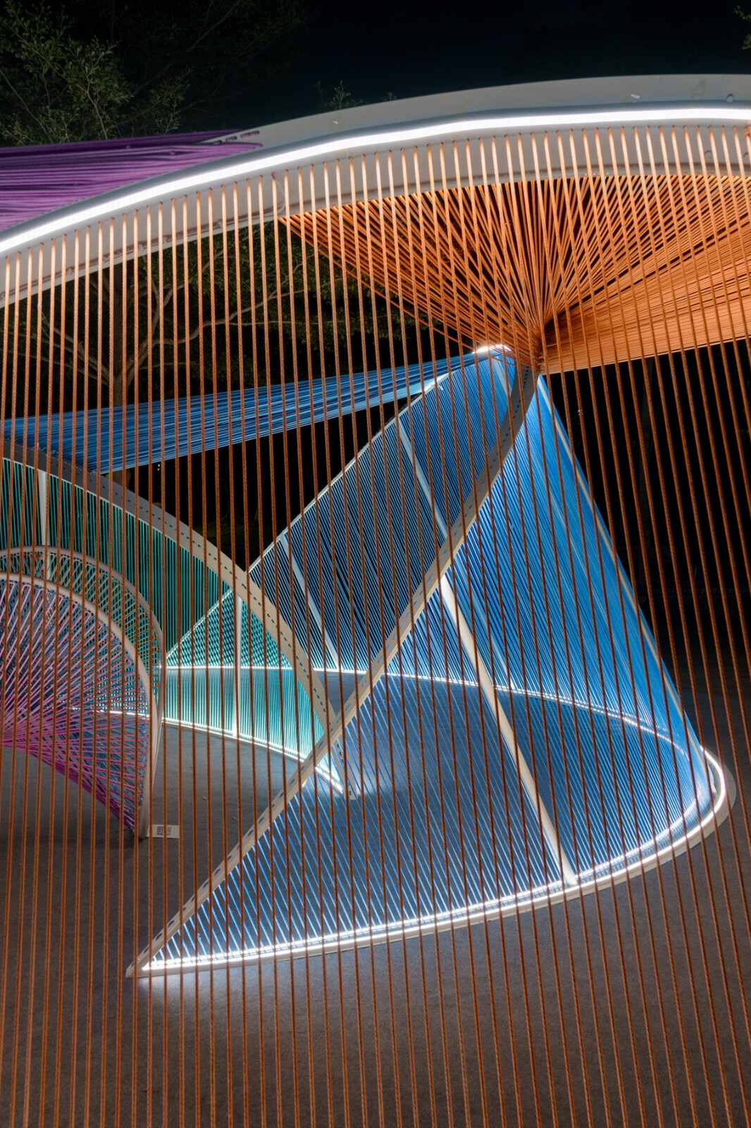 来者在其间可行、可立、可观,体验到不同颜色和光影的变化。在光与影的交错中,邂逅了一场时光与色彩的重奏。丝线交织的空间里,观者能够观察到自己和他人在同一维度和不同时空下交错的影像。