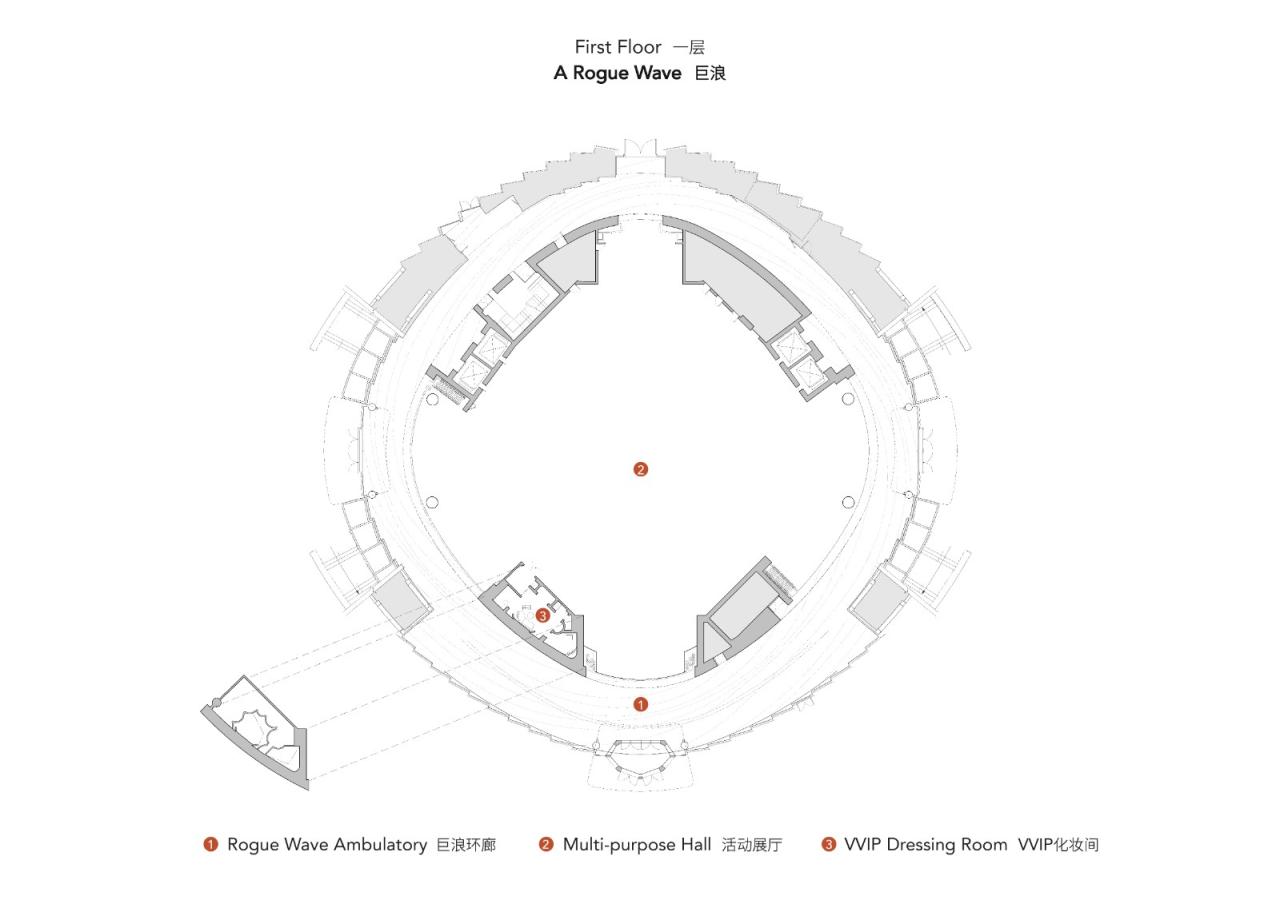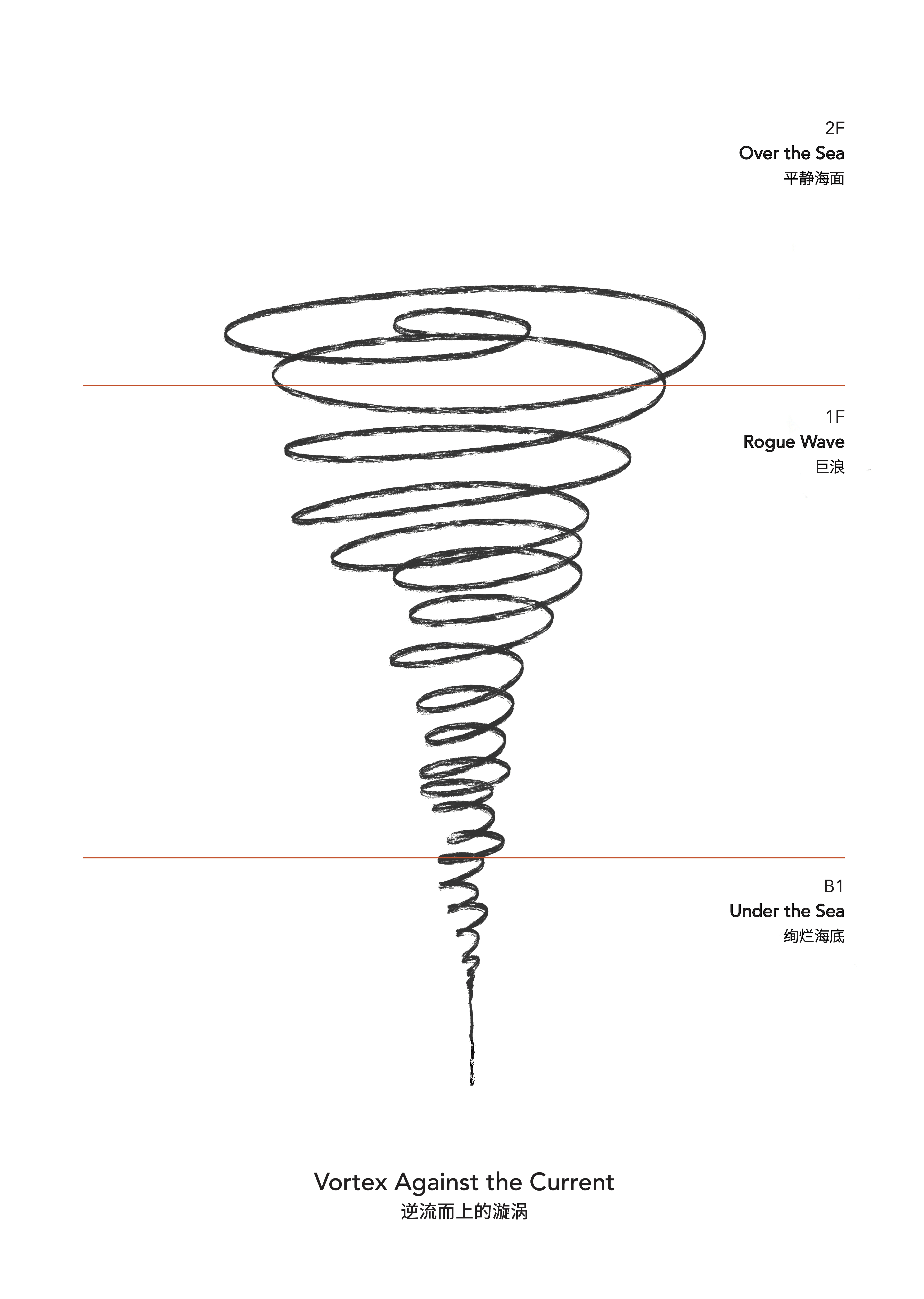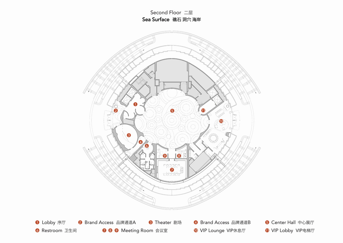 二楼是项目展厅,它是漩涡褪去的平静有着涟漪的水面以及礁岸。二楼所有的辅助功能比如门厅,放映厅,会客厅,厕所,贵宾休息室,大小会议室都藏在礁岸后面,它们是抽象的洞穴,装着各种各样的需求。