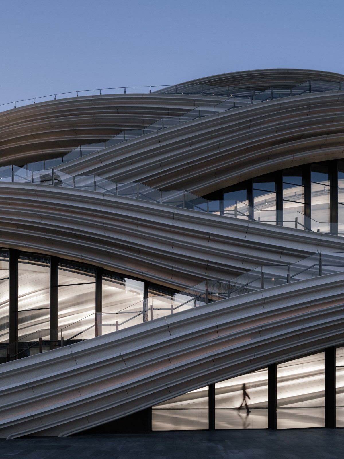 不同层次的花纹极好隐藏了外立面和展厅外墙之间的结构和设备管线,让漩涡在视觉上和外立面独立出来而不粘连。漩涡成为视觉的主宰要素,把象征意义在视觉上的张力最大化表现出来了。