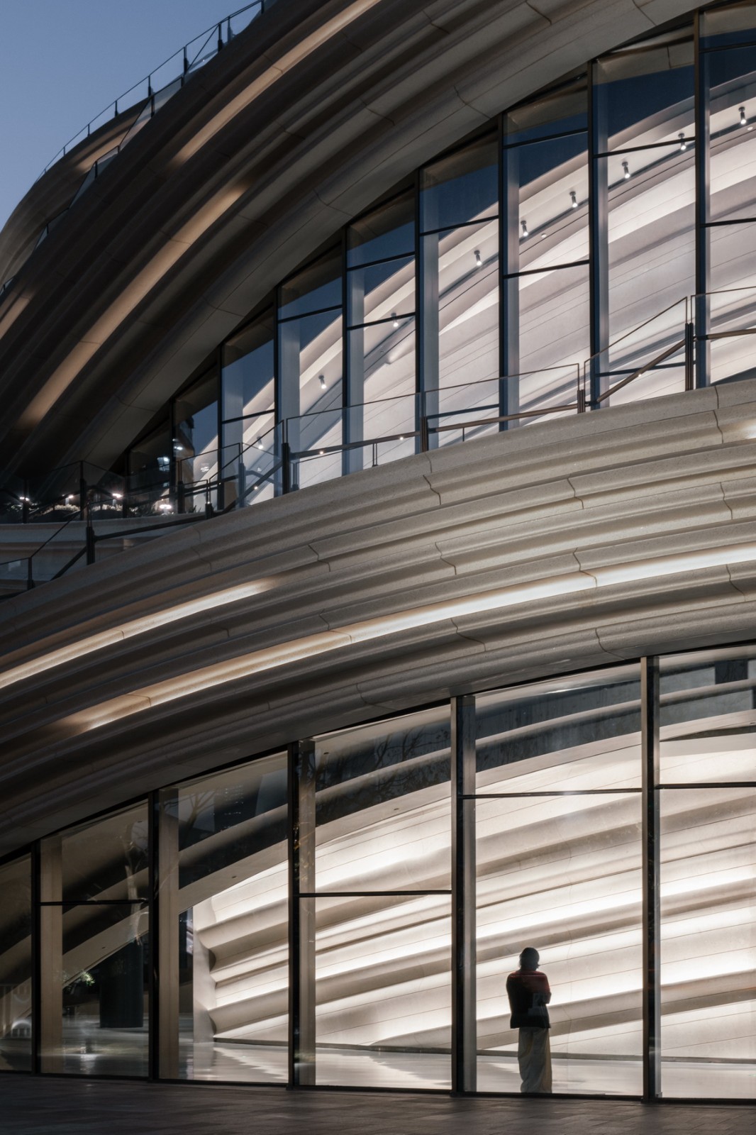 你站在建筑外可以看到它似乎一直在旋转,和立面的飘带形成一种奇妙的平衡。尤其在晚上,它成为上海最生机勃勃的滨江地带的引人注目的新地标,一个中心。