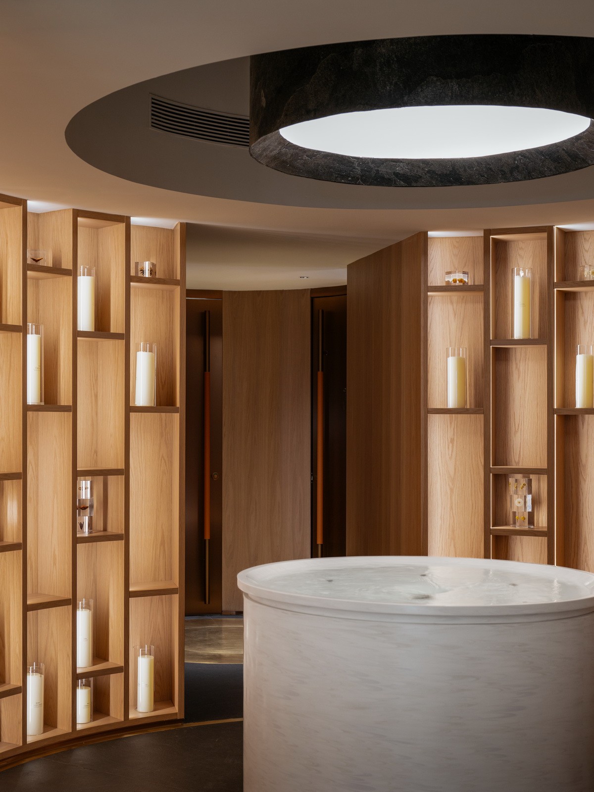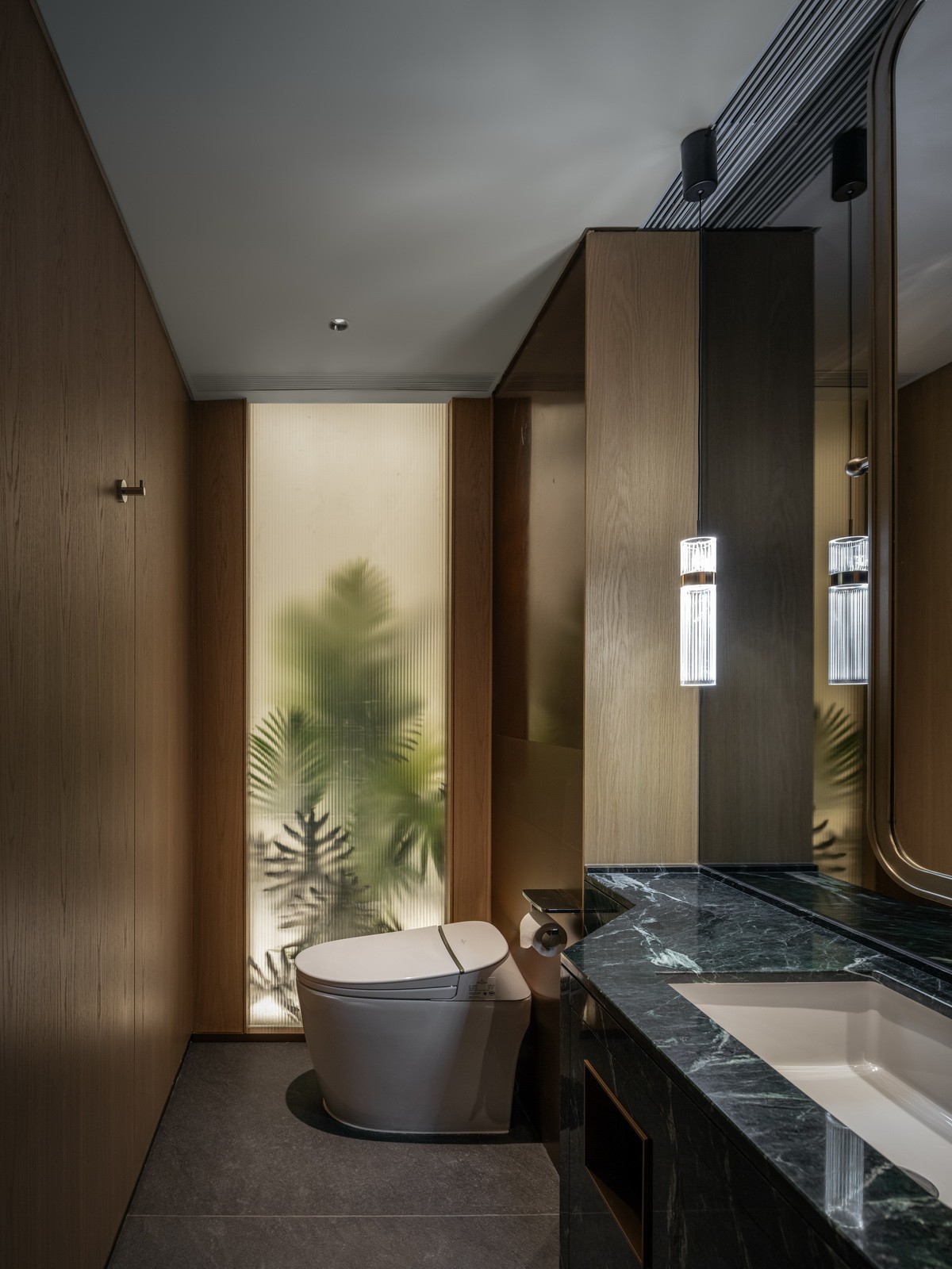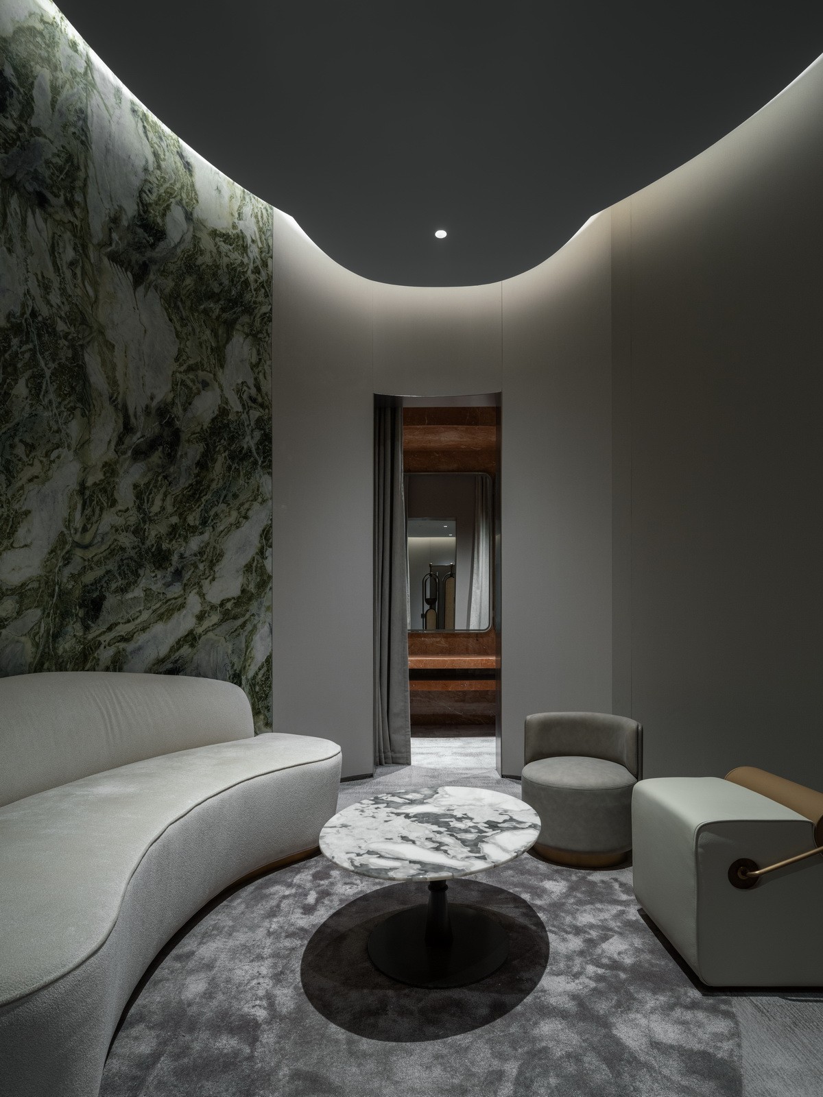 出于对称以及象征痴迷,也是对曲折礁岸的提炼,大厅呈现一个海棠如意的形状,如意的一个缺口,就是卫生间的前厅,建筑师在这个面对大厅敞开的空间中央设置有一个大理石台盆,里面水浪翻滚,这个造景就是缩小的漩涡。对的,建筑就这样在每个细节创造着充满隐喻的欢愉。