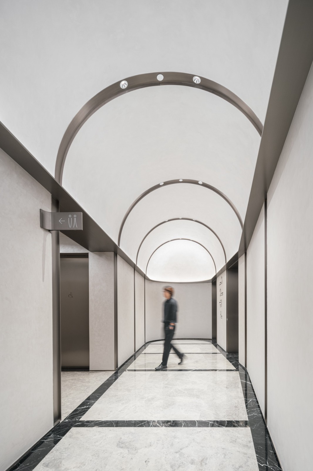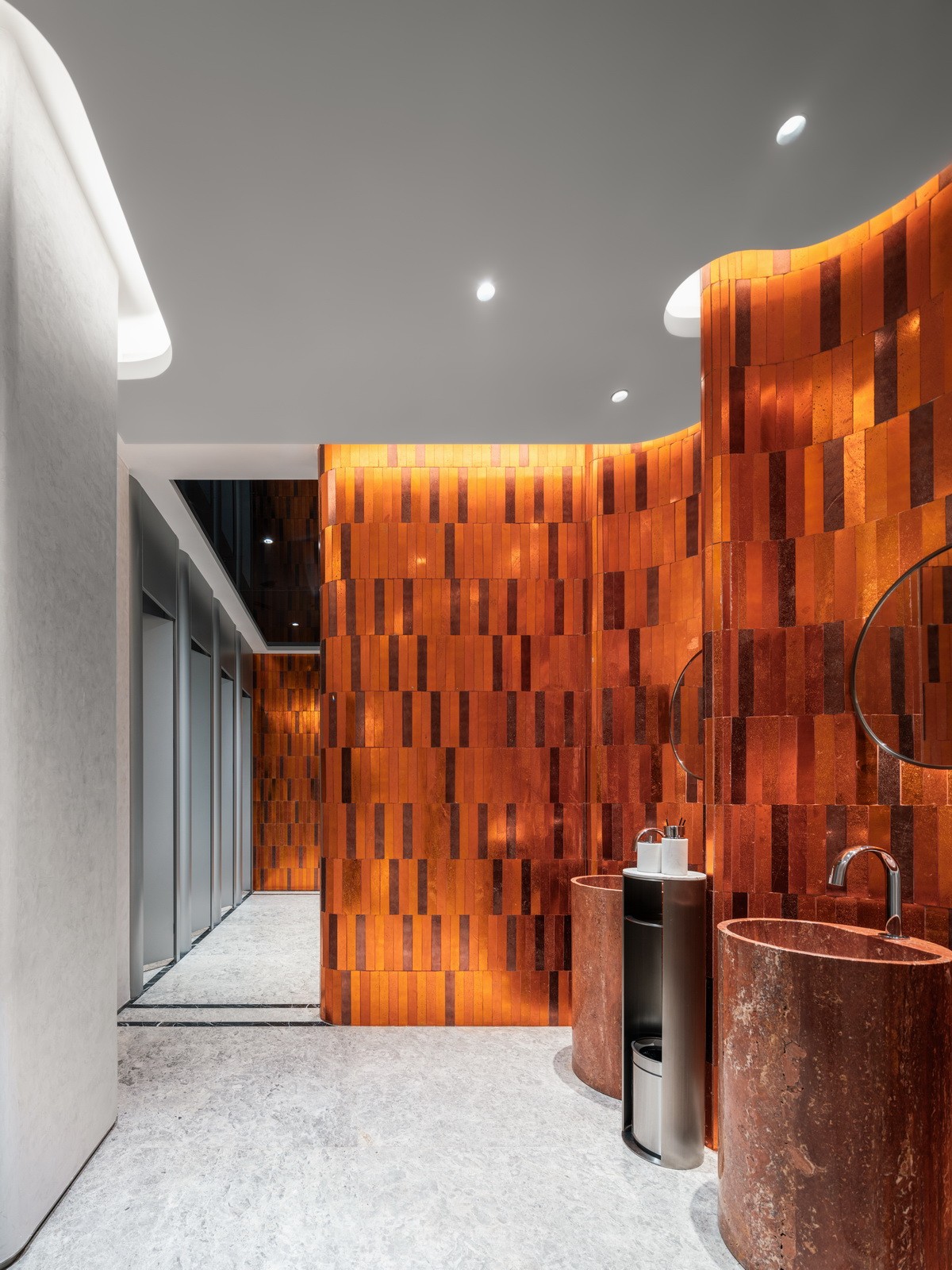 西岸漩心地下室是服务功能,安排了公共走廊,公共卫生间和多人化妆间和Vip化妆间。它们是漩涡之下的水底世界。建筑师在走廊营建了海底光线的体验同时,用三种不同颜色的电镀石,以及珊瑚红石材分别塑造了卫生间和化妆间的珊瑚意向而构建了地下一层珊瑚礁的象征意义。