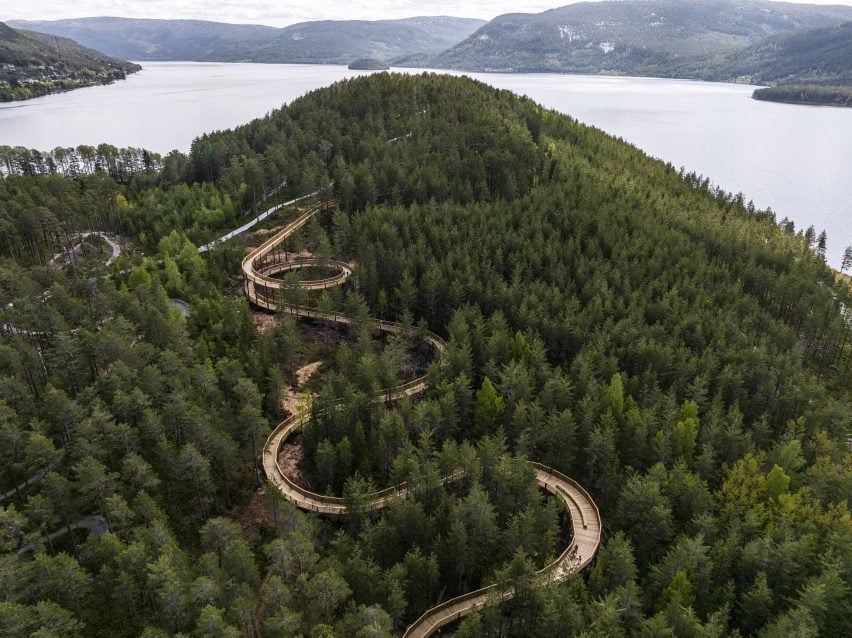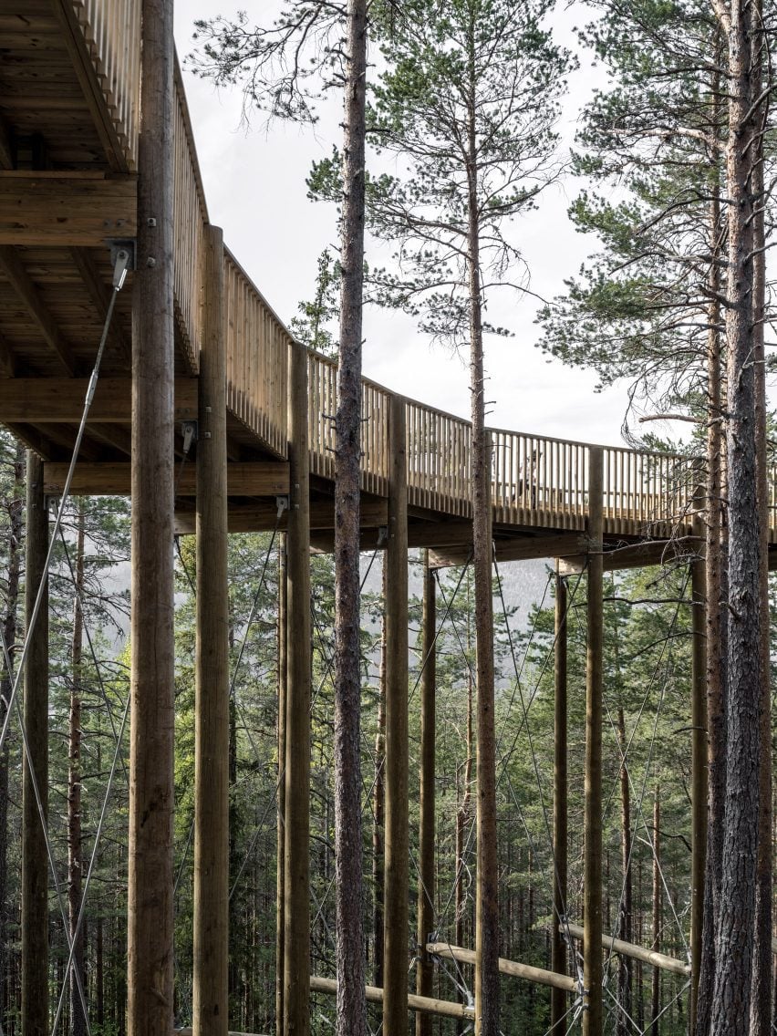 这条树顶走道长一公里,沿着海拔338米的Klokkarhamaren山的斜坡而建。去步道的游客被引导从松林地面出发,经过一个湖泊,在树梢之间向上到达Klokkarhamaren山顶。在小路的尽头,EFFEKT工作室设计了一个直径50米的圆形观景台,提供了周围自然景观的全景。