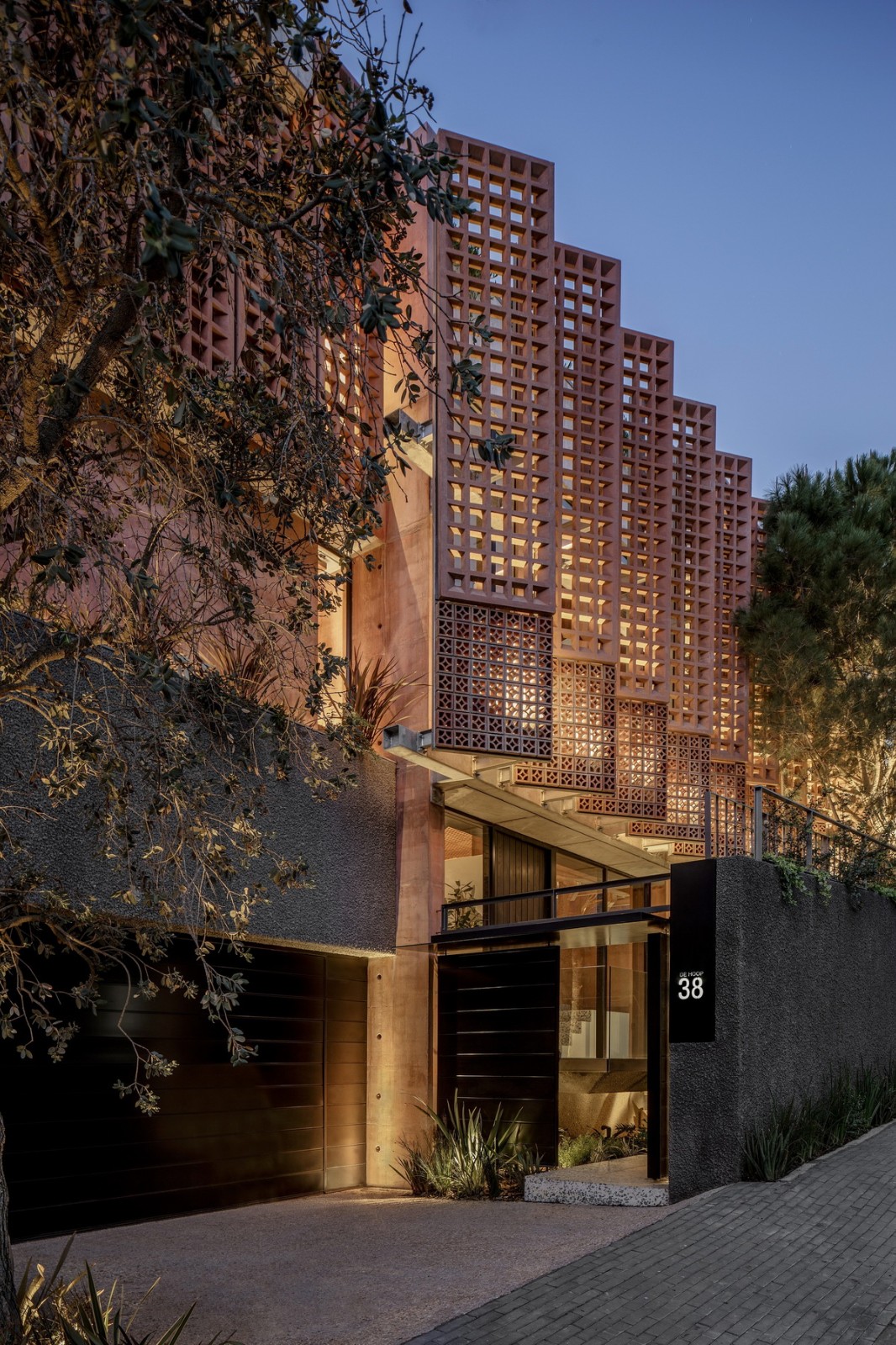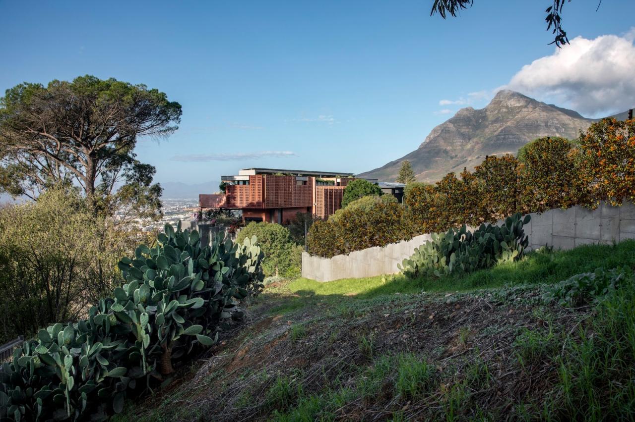 从街道上看,围墙和基座采用灰色条纹灰泥装饰,这是开普敦中世纪住宅建筑的一种参考,也与开普敦大学校园及其在城市建筑遗产中的重要地位有关。不过,该建筑的主要特征还是体现在上层独特的红色色调混凝土外遮阳板上,尤其是安装在钢框架上的斜角预制混凝土屏风,它为大面积的玻璃幕墙提供了遮阳和私密性。菲利普说,颜色的选择部分是基于他和家人去墨西哥旅行的回忆。他还重新利用了构成旧围墙一部分的陶土砖块,他说,这些砖块“被移走、储存、喷砂、运回并安装在钢结构屏风上”。