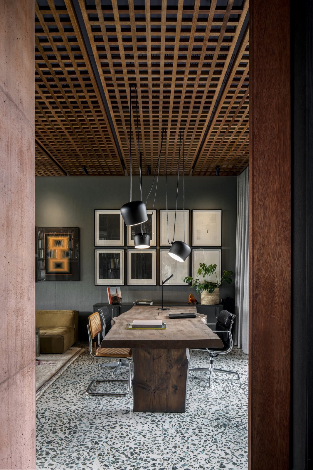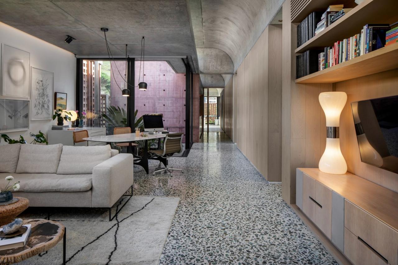 实心石材在家具中也占有重要地位。例如,客厅里引人注目的四件式服务器、主卧室里的控制台和脸盆都使用了帕尔花岗岩,这些都是由帕尔的第三代石匠 JA Clift 制作的。其他与 50 和 60 年代有关的传统装饰包括麻布墙。木格天花板的设计(采用当地染色较浅的硬木 Meranti,与混凝土浇筑的屏障相得益彰)增加了室内外的丰富性和连续感。其他元素则更加“古怪”或感性。菲利普说:“厨房里的早餐台是旧餐桌。”我们对它进行了改装,将其安装在不锈钢台面上。这栋住宅对材料和遗产的探索与大胆的美学相结合,为这座城市不断变化的城市环境提出了一个创造性的解决方案,同时也为郊区景观增添了一道亮丽的风景线。