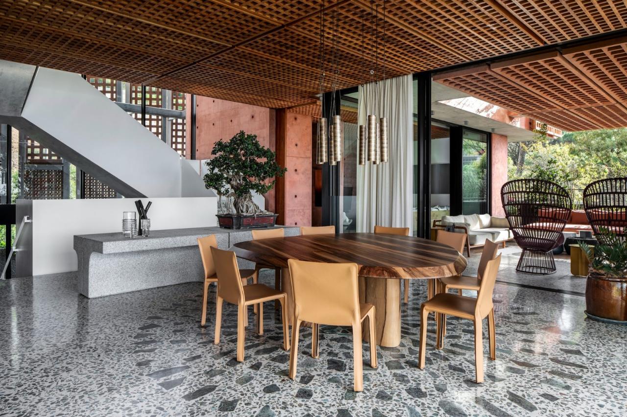 室内装饰为菲利普与材料的接触带来了新的复杂性和趣味性,通常包括广泛的研发、创新和合作。他所选择的室内装饰材料与工匠和手艺人的技能所固有的活遗产进行了深思熟虑的对话。客厅、地板、楼梯和室外铺装广泛使用的抛光聚合物混凝土地板,是用西开普省纳马夸兰地区历史悠久的铜矿的副产品–绿色石骨料制成的。泳池周围和室外用餐区的部分区域使用了罗斯滕堡花岗岩铺路,以及当地砂岩铺路。