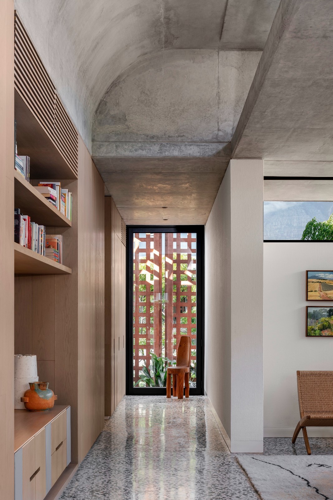 建筑师 Philip Olmesdahl 是开普敦 SAOTA 工作室的负责人,他在这块位于城市中心的场地附近居住了 15 年多,一直对其赞不绝口,后来才设法拥有。然而,时机恰到好处。他说:“当孩子们进入青春期时,我们需要一个更宽敞的家。成为自己的客户为菲利普提供了挑战极限的机会–将多年来与 SAOTA 合作设计房屋所获得的智慧与更多异想天开和实验性的东西结合起来。建筑师在设计自己的住宅时,可以多一点乐趣;可以少一点智慧。”这并不意味着他自己的住宅设计不那么严谨,而是菲利普可以借此机会探索建筑理念,而不一定觉得有必要提出一个明确的声明或结论性的理论,并将个人的联想和喜好融入其中。