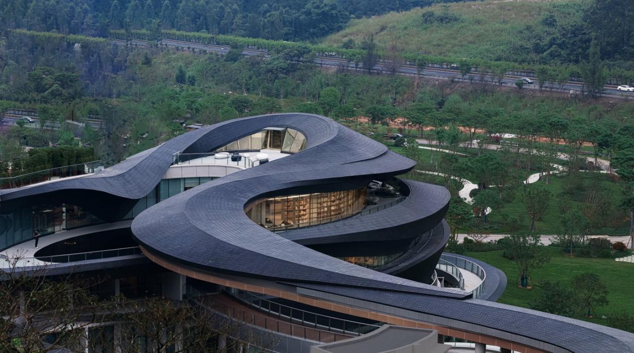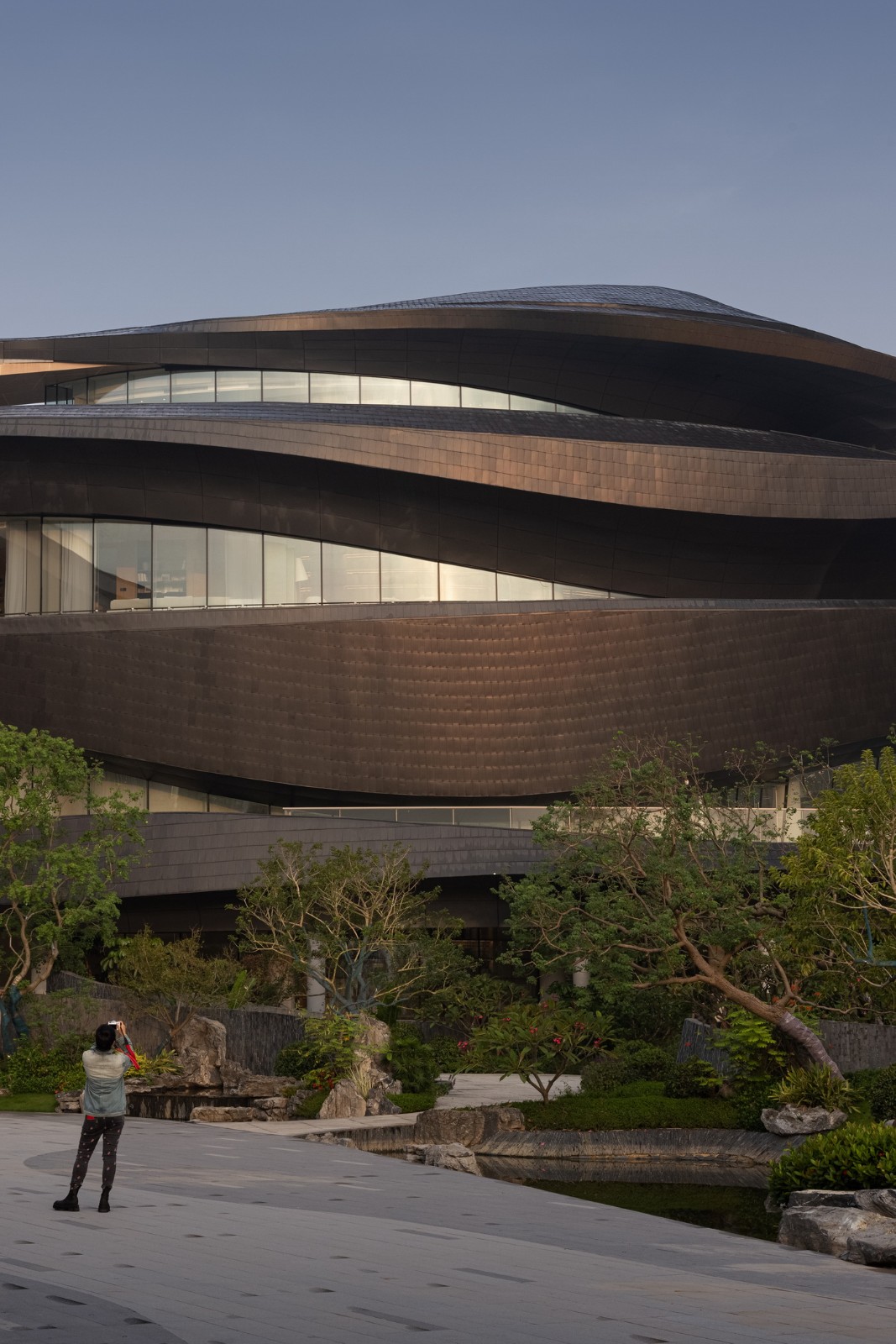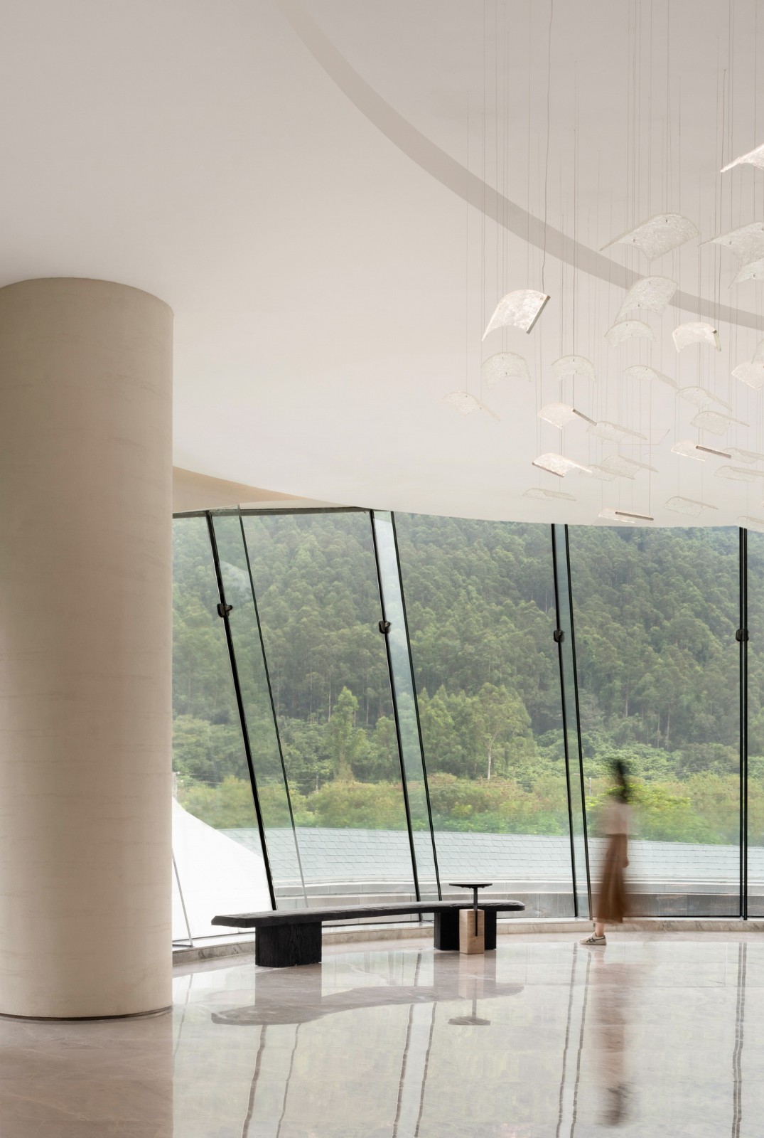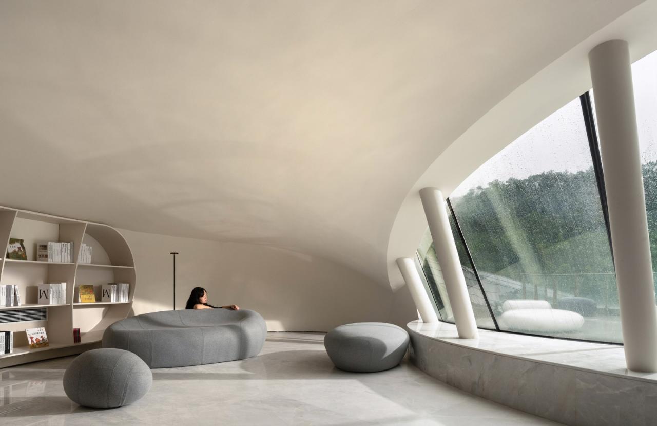 从外部看,建筑似巨轮破浪前行;从内部看,檐口与山体融为一体,展现自然与人工交织的景致。这种体验是对传统画卷体验的升级。空间处理与叙事关系契合人们对空间的想象:清晨阳光照在建筑上,云雾缭绕,仿佛置身于山间游船。艺展中心通高曲线展架和中庭挑空空间,提供连续视觉体验。书局沙龙空间成为俯瞰全景的绝佳视点。建筑室内整体性与立面的关系形成独特视觉冲突,赋予建筑温柔与力量的特质。宿集后部去除遮挡,大面积开窗引入自然景色,让人享受宁静时光。