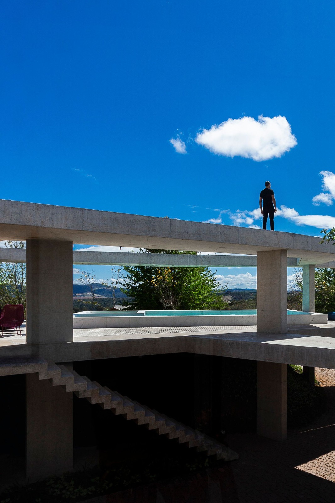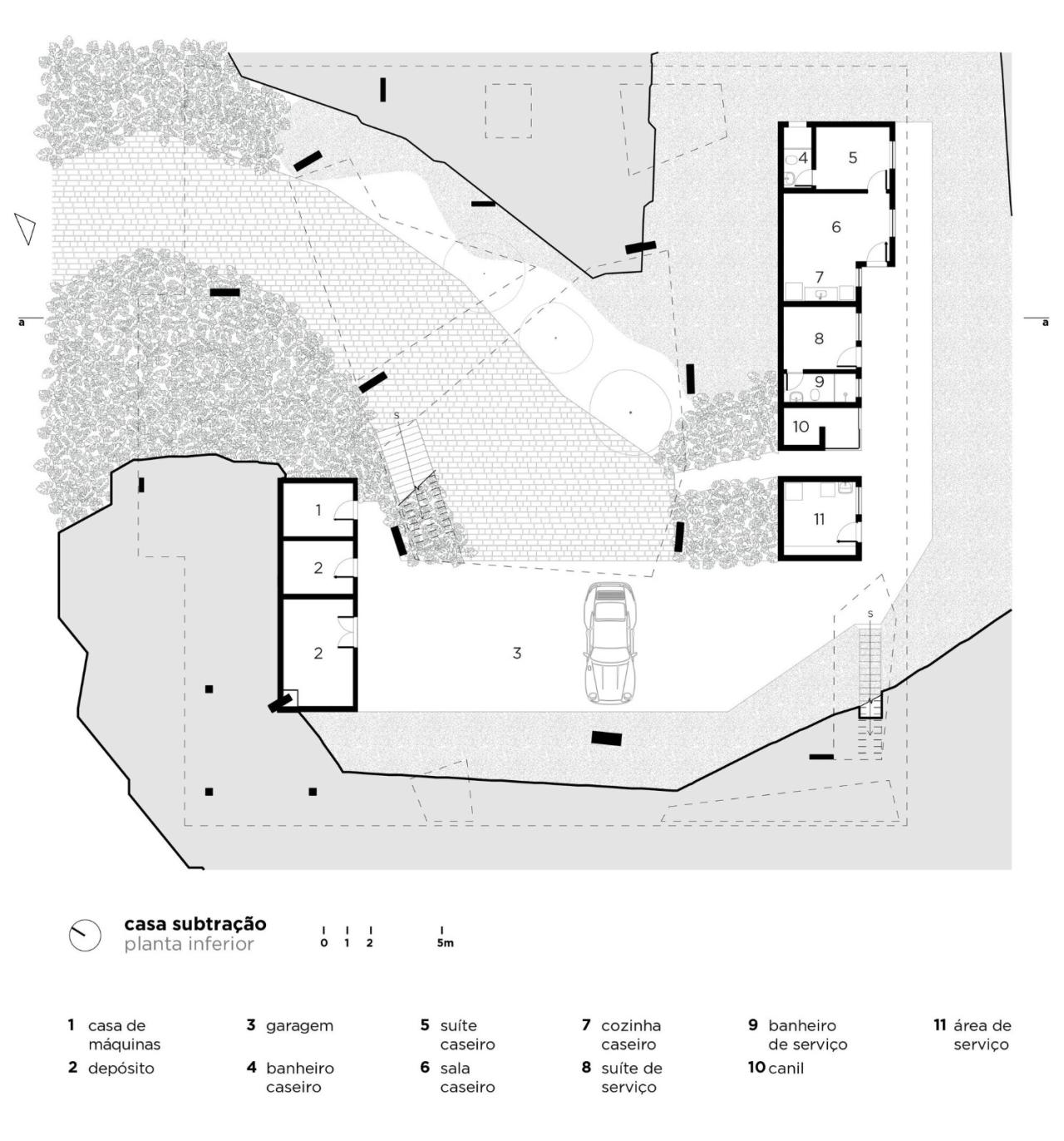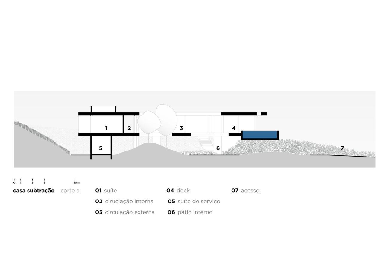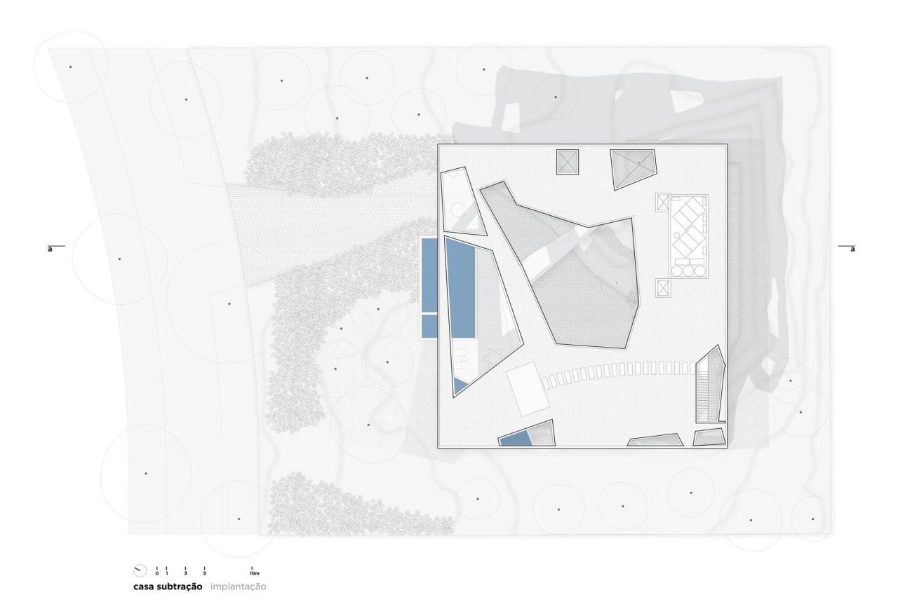 在处理该项目时,建筑师们决定挑战其作品中的主流逻辑,即他们所来自的圣保罗学派,将结构概念视为空间的创造者。因此,他们选择了一种 FGMF 作品中少见的策略:从两个高架裸露混凝土平面的理论构思出发,占据整个可能的土地面积,并尊重后退和该地区的其他适用法规。根据这些尺寸,他们研究了房屋的各种占用示意图,包括社交区、私密区、休闲区和服务区,直到找到看起来最合适的组织方式。