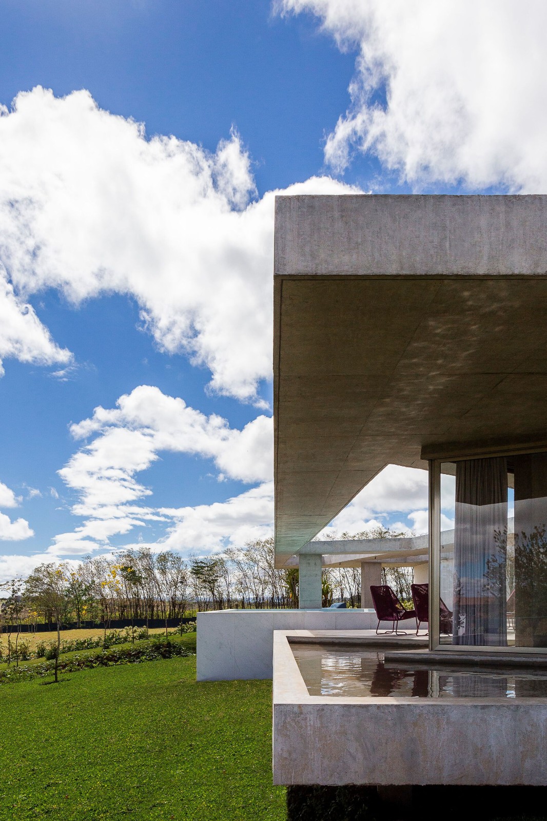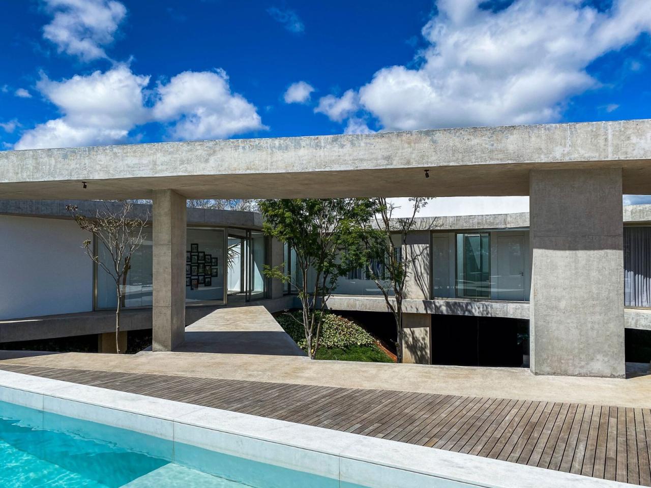 该住宅采用现浇钢筋混凝土结构,地面采用抛光混凝土饰面,砌体采用白色涂料,同时具有现代主义和简约主义的美感。泳池被巧妙地安置在第一块楼板上,是唯一打破派对组织平面边缘僵硬感的元素,它反射出柔和的光线,就像打破了裸露混凝土的主流,为环境增添了一丝宁静。景观设计被建筑师视为建筑的基本要素,从一开始就与建筑融为一体,与内外空间相得益彰。