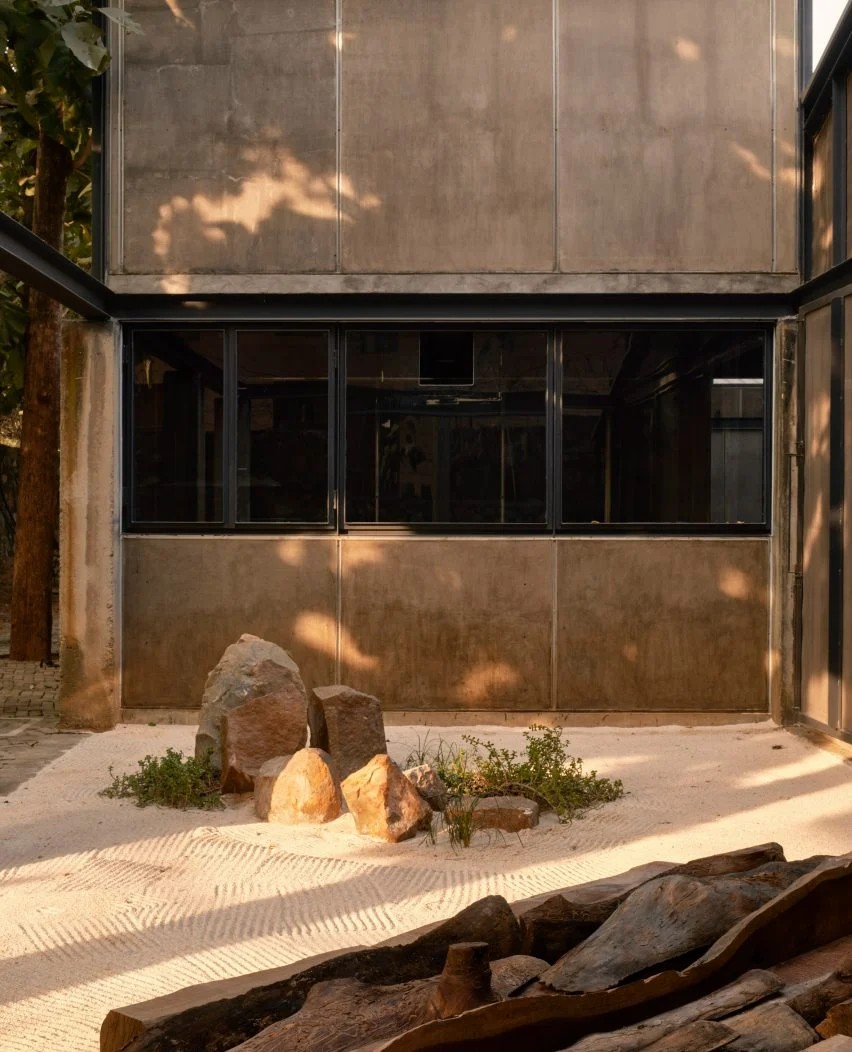 阿威工作室说:“这个艺术家的驻地覆盖和包裹了旧结构,同时通过轻钢、玻璃、竹子和木干墙结构的介入创造了结构对比。”东边的两个卧室建筑包含一对卧室,由浴室分开,编织的竹屏风区域向外开放,混合了半封闭和开放的砖砌露台和花园。工作室的工作空间和厨房位于西面,高斜屋顶的窗户和通高的玻璃区域与花园建立了紧密的联系。阿威工作室说:“新旧、室外和室内、公共和私人之间的交织成为最重要的理念,”阿威工作室说:“模仿坐在树下的体验,半开放的空间从现有的柱状网格结构中雕刻出来,提供一种保护感,而不产生围栏。”材料的色调,无论是内部还是外部,都是由简单的原材料定义的,这些原材料会随着时间的推移而进入花园和周围环境。