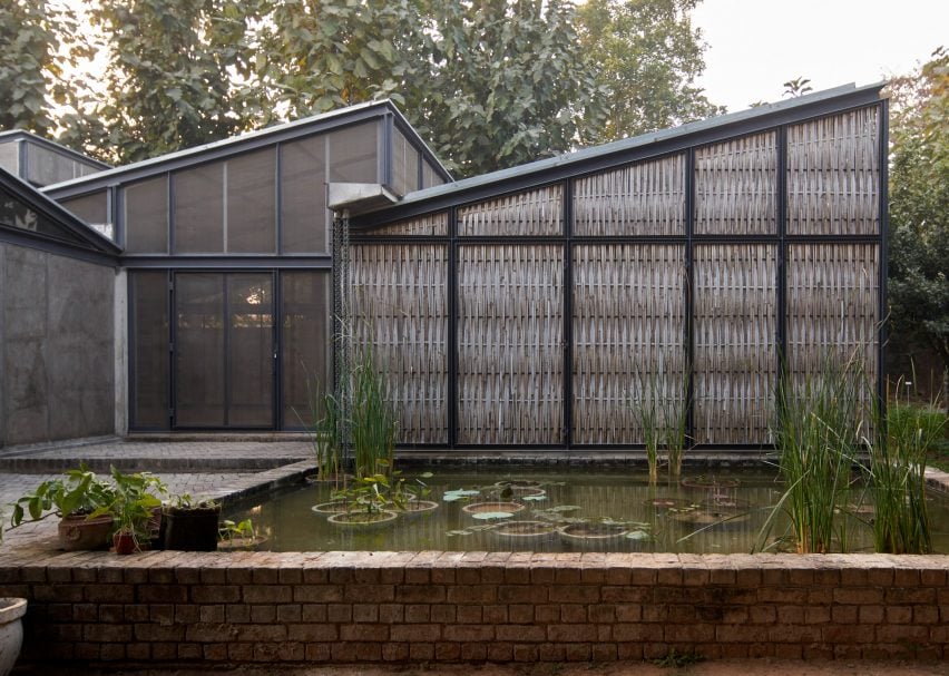 竹子屏风为建筑创造了一个可渗透的半透明外壳,从外部到内部的连续性是通过抹灰墙、混凝土地板和裸露的钢框架天花板创造的。阿威工作室说:“随着时间的推移,竹子屏风会老化并改变颜色,这是对无情的衰老过程的颂歌,模仿并邀请大自然多年后接管。”