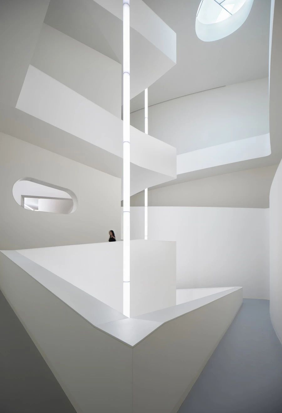 中庭的光柱和螺旋的坡道串起五层纯白空间