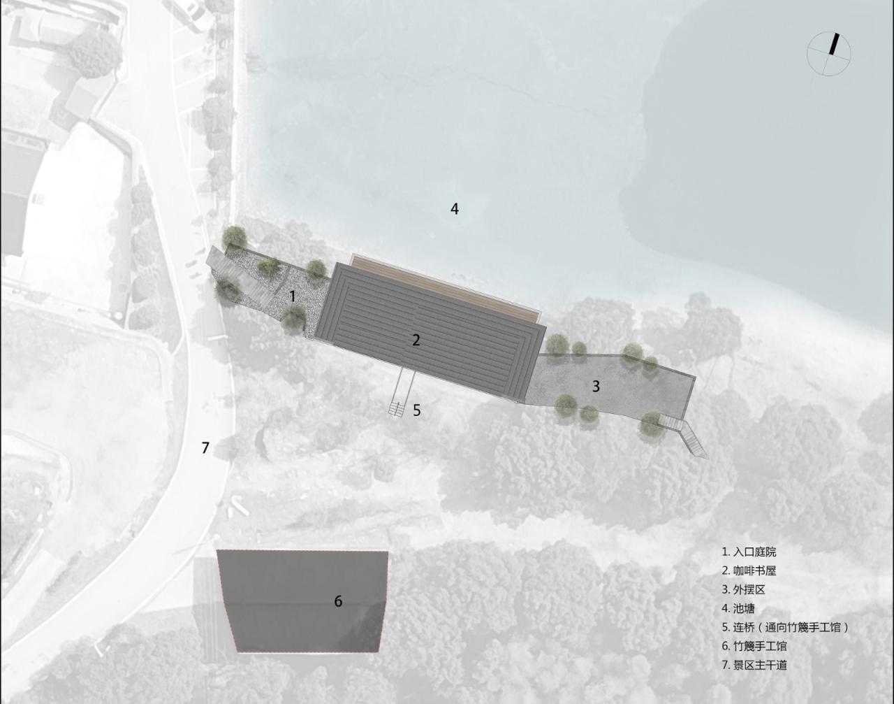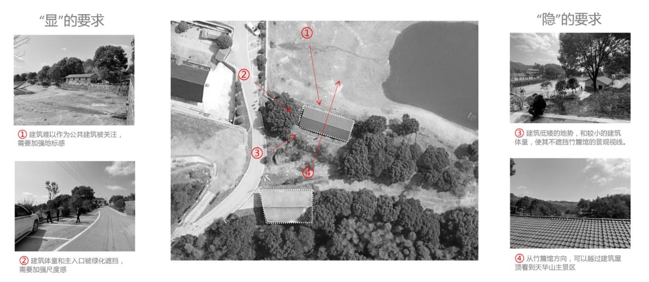 02 “显”-“隐”之间:场地中潜在力量的感知与梳理我们决定从感知场地开始,从场地周边来寻找推进设计的力量,找到可靠的设计线索。场地由西侧道路进入,南侧有一座业已建成的竹篾手工体验馆,北侧则可以远瞰景区主要山脉:天华山。以地形而言,场地为一处低洼地带,整体低于景区主干路约两米,因此原建筑在场地中呈现比较“隐”的状态,建筑的主入口和建筑体量不太容易被快速来往的景区车辆和人流所感知,这显然是不利于其作为公共服务设施的使用需求,因此如何理解和回应这个低洼的地势,成为了设计构思首先关注的焦点。
