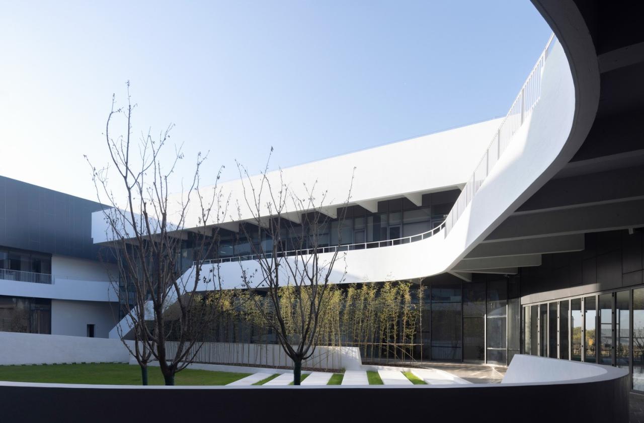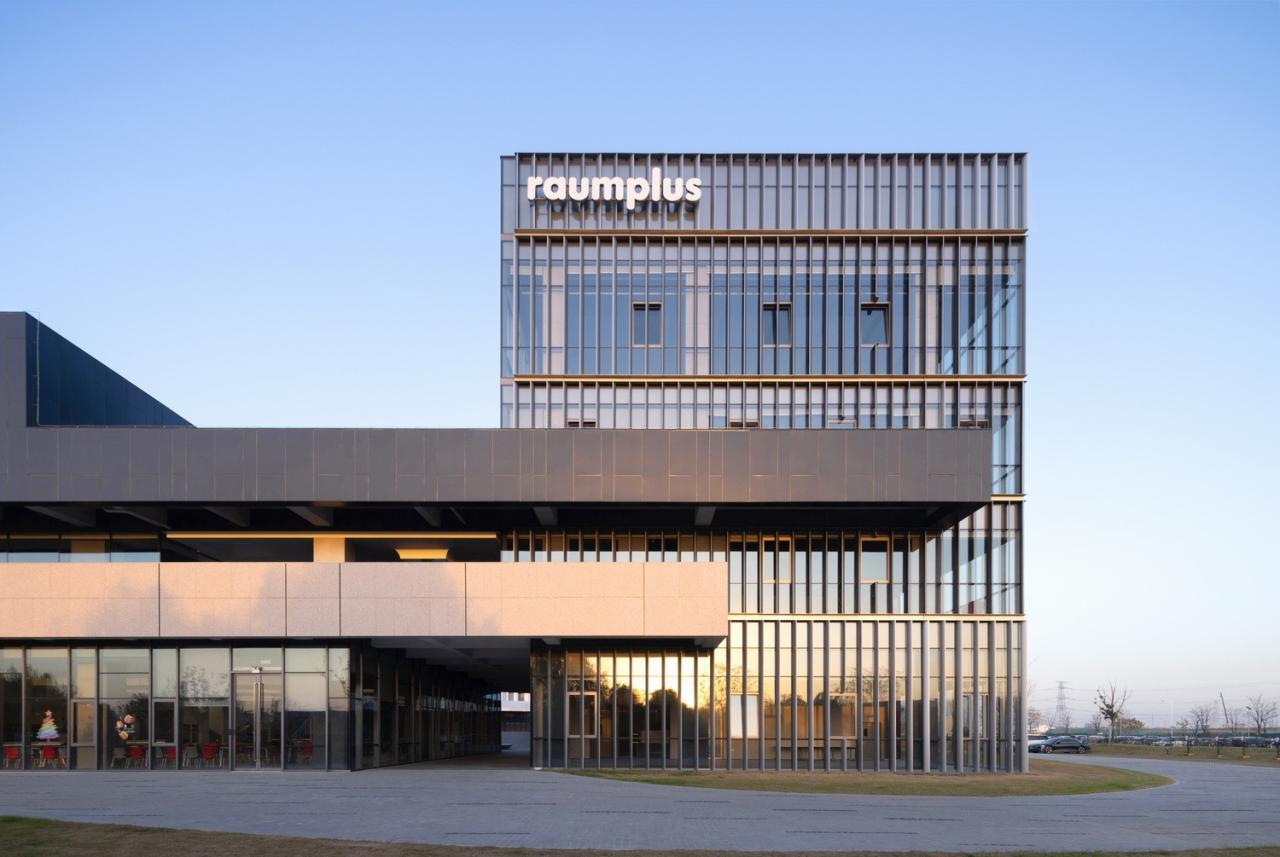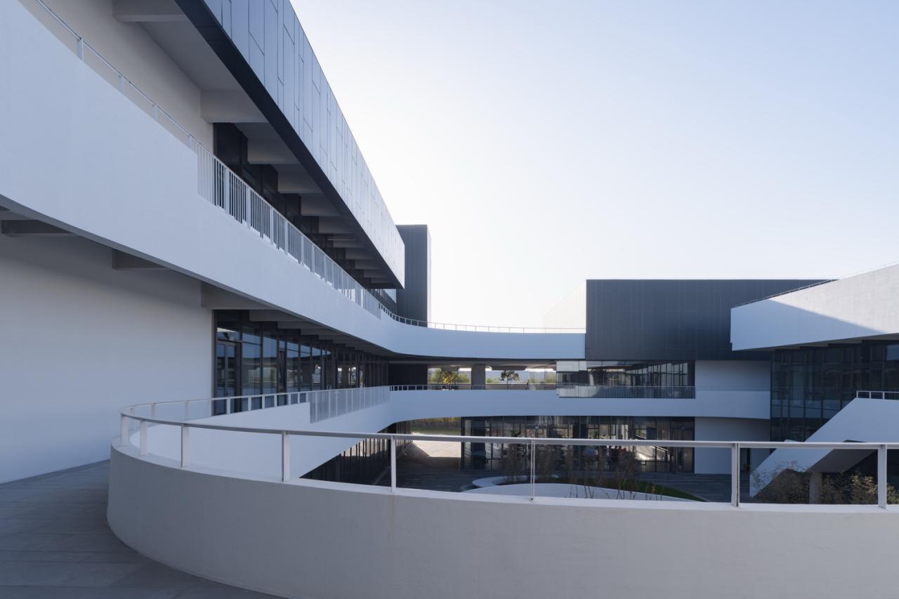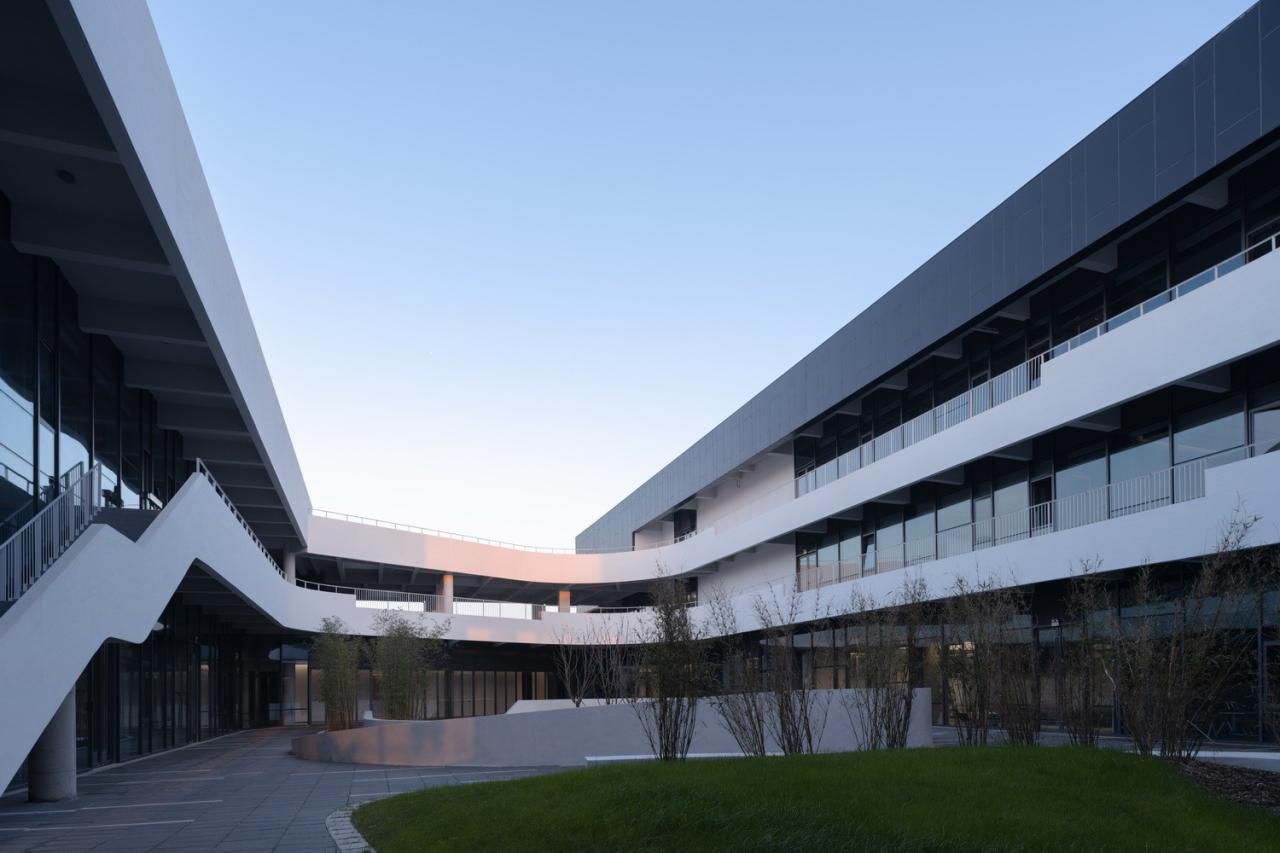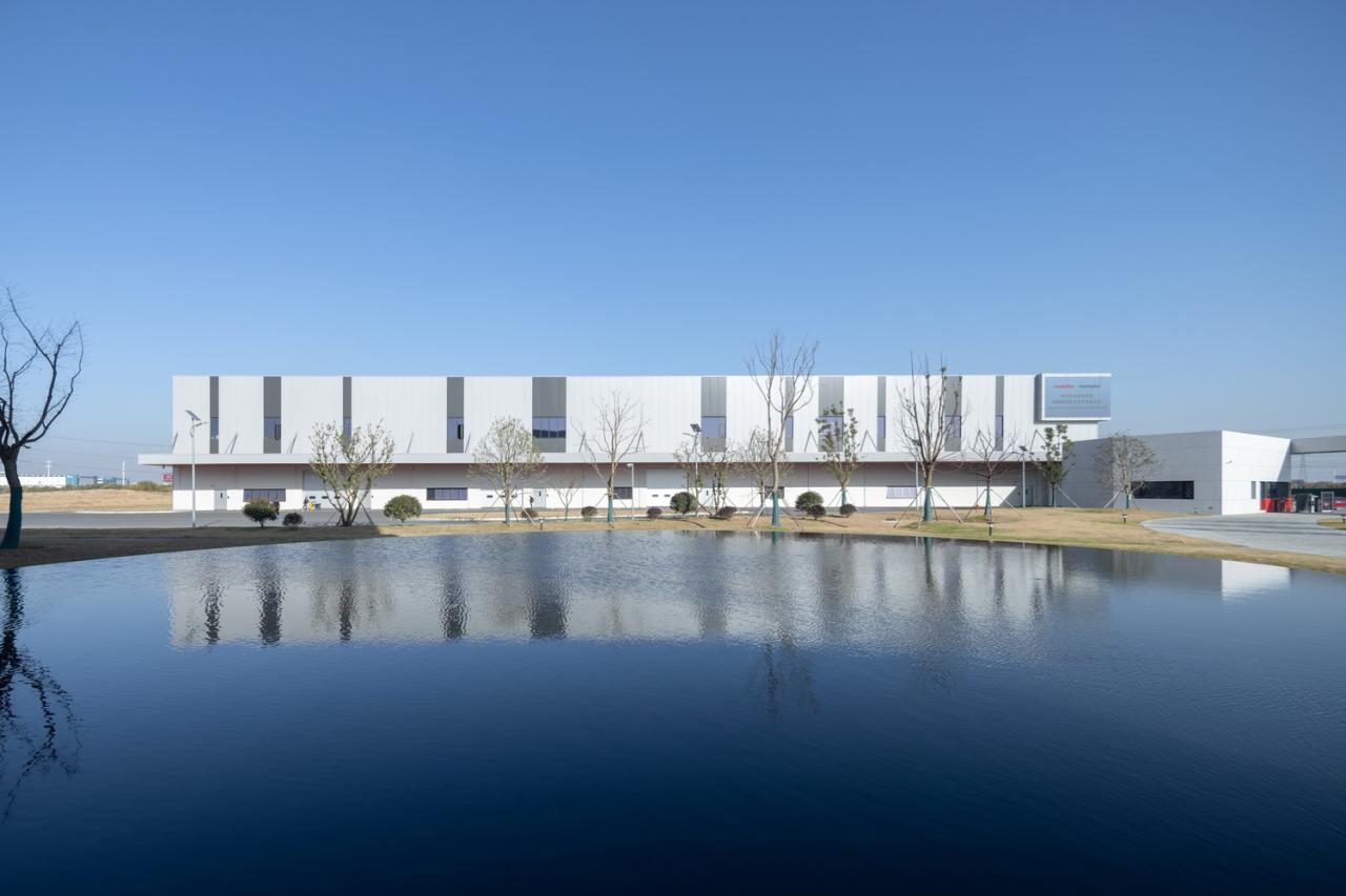 室外材料的色调延伸到生产厂房的外墙。垂直方向的渐变为水平体量提供了视觉韵律,同时与窗饰设计相融合。厂房内部采用大量天窗照明。生产线在几乎零粉尘的室内环境中运行。景观设计基于海绵城市的理念,借助自然雨水的地下渗透。大型水景和起伏的地面景观打破场地本身的单调感。建筑南侧种植了大量树木。随着时间的推移,这些树木将逐渐长大,为停车区提供遮阳,并为研发中心的主立面提供视觉缓冲。