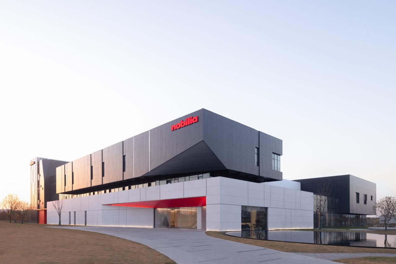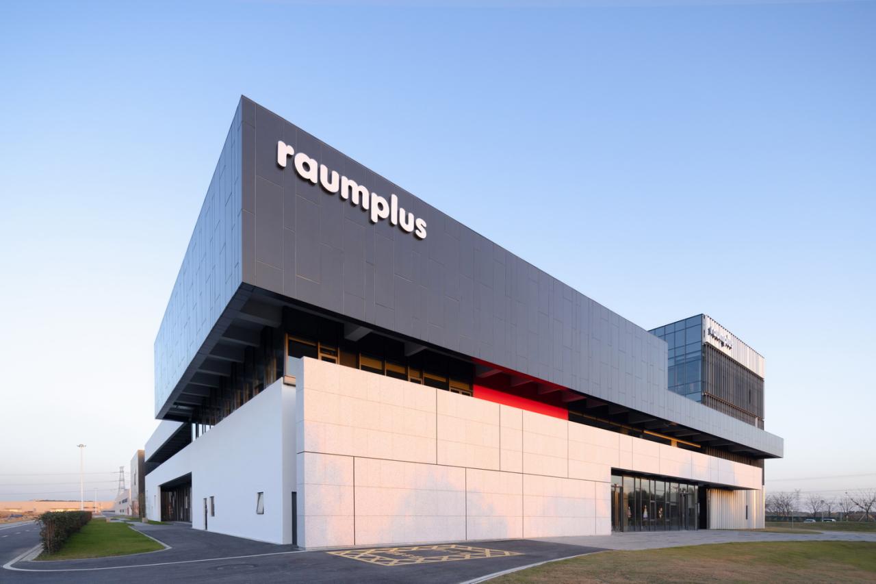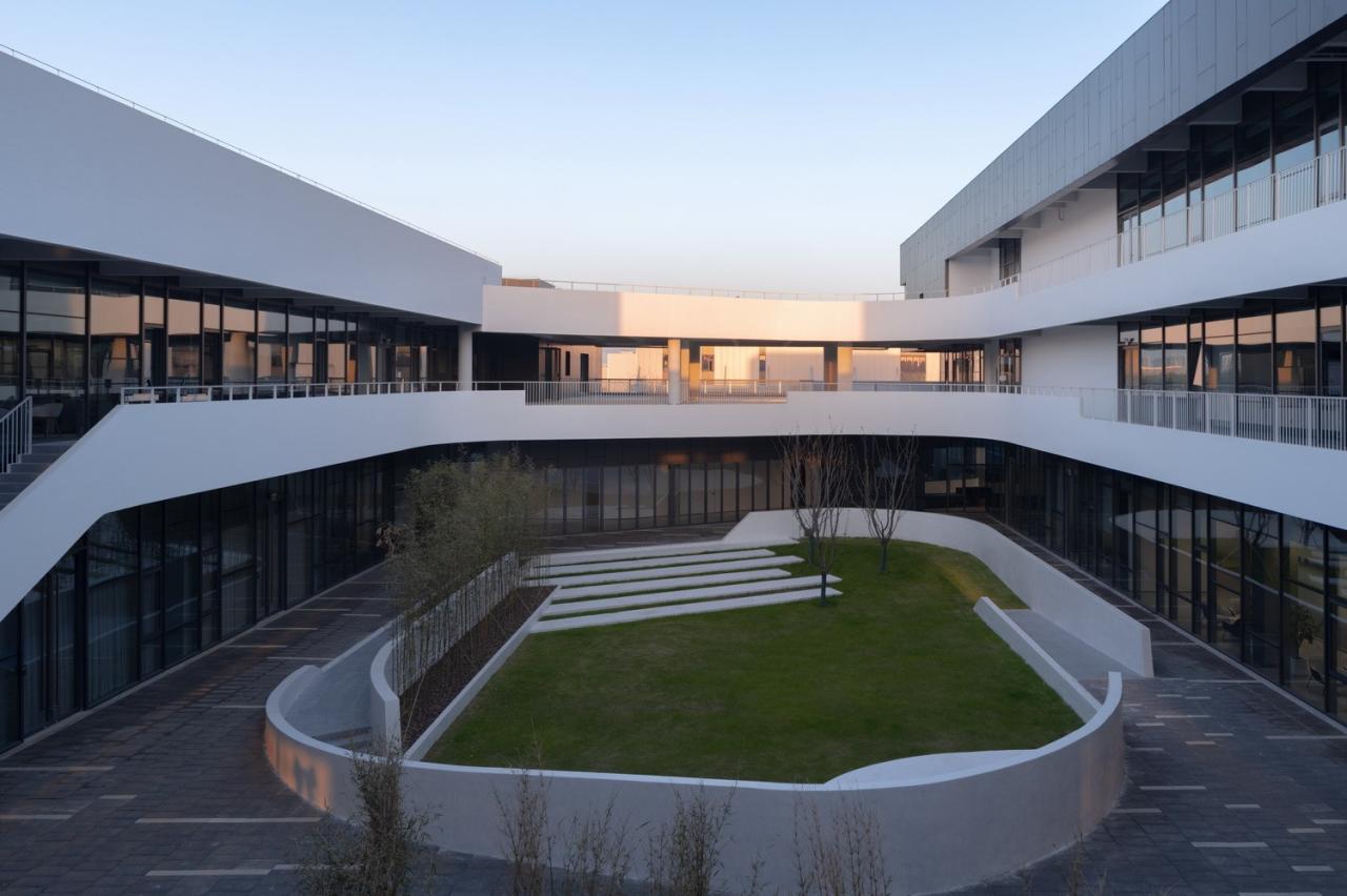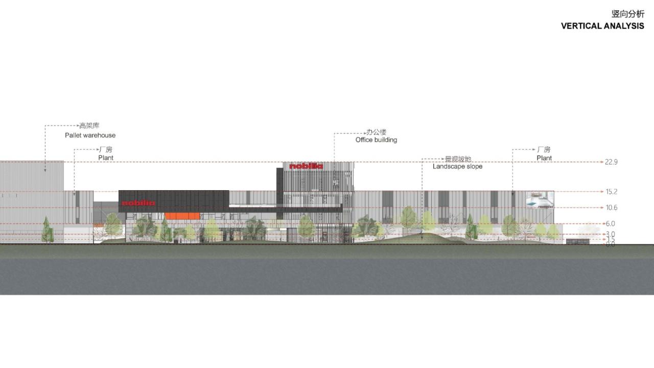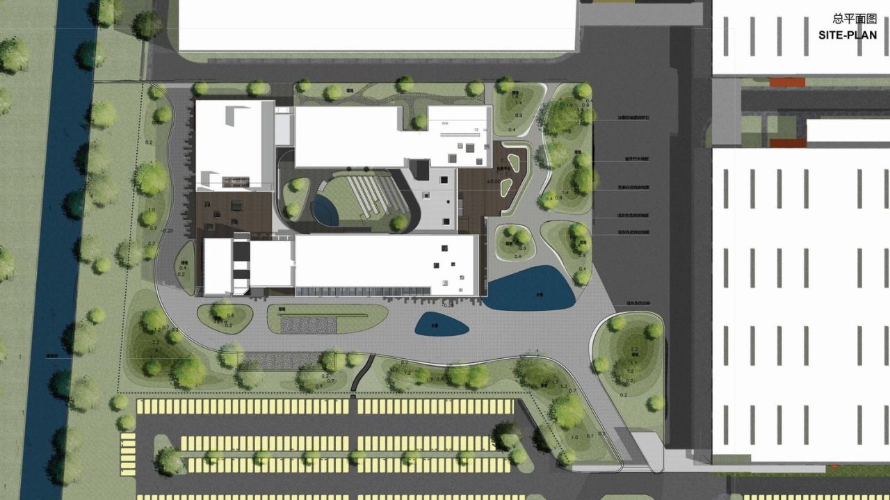室外材料的色调延伸到生产厂房的外墙。垂直方向的渐变为水平体量提供了视觉韵律,同时与窗饰设计相融合。厂房内部采用大量天窗照明。生产线在几乎零粉尘的室内环境中运行。景观设计基于海绵城市的理念,借助自然雨水的地下渗透。大型水景和起伏的地面景观打破场地本身的单调感。建筑南侧种植了大量树木。随着时间的推移,这些树木将逐渐长大,为停车区提供遮阳,并为研发中心的主立面提供视觉缓冲。