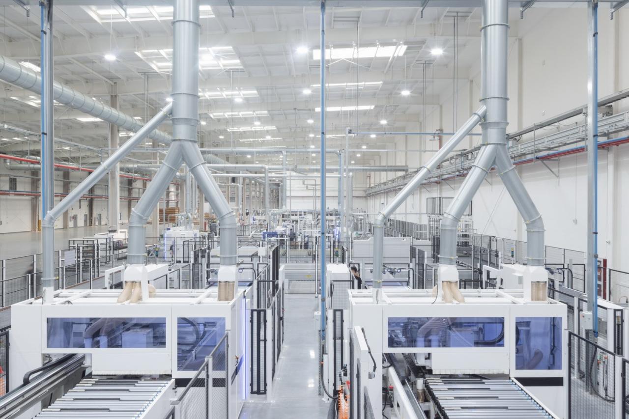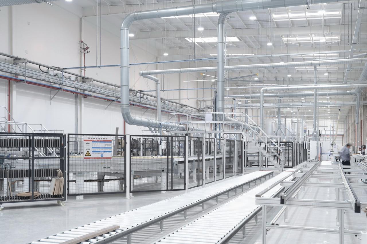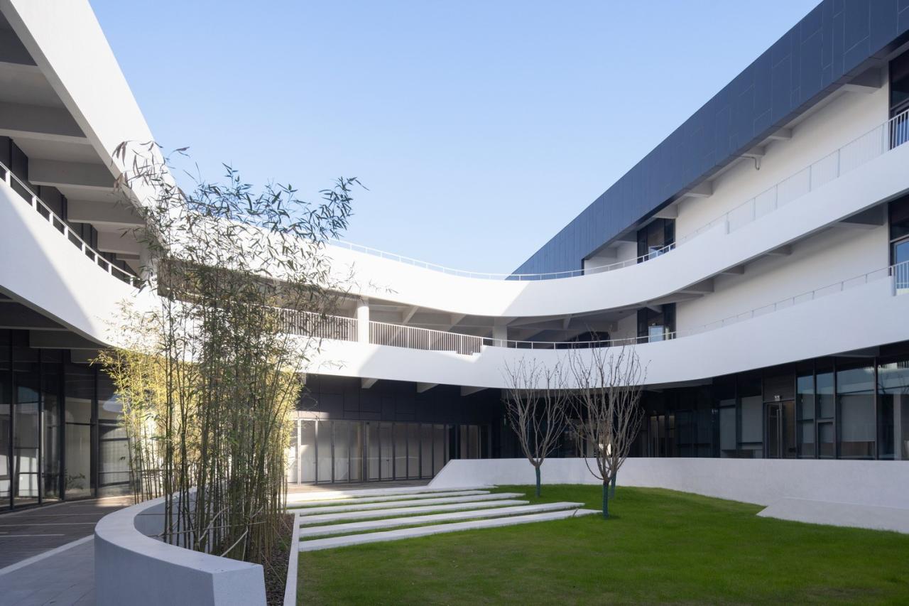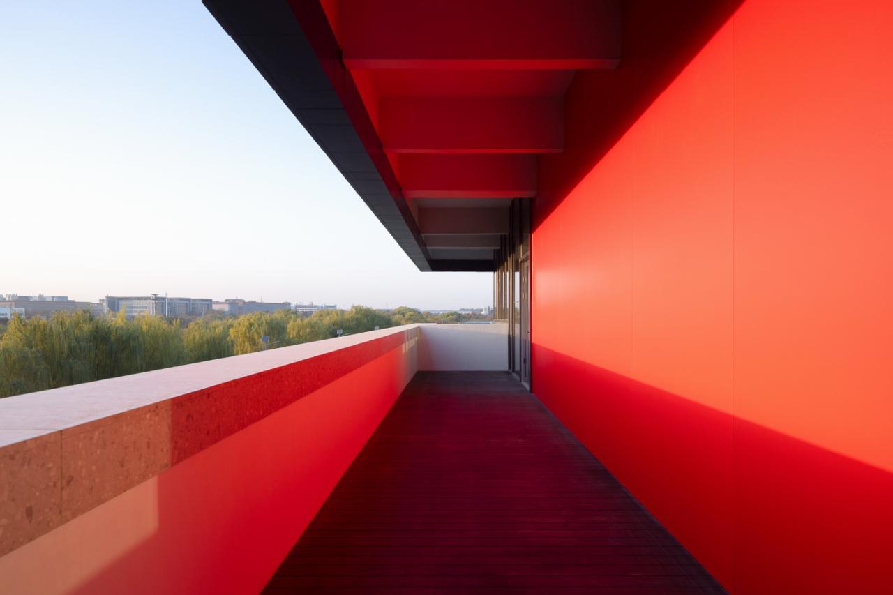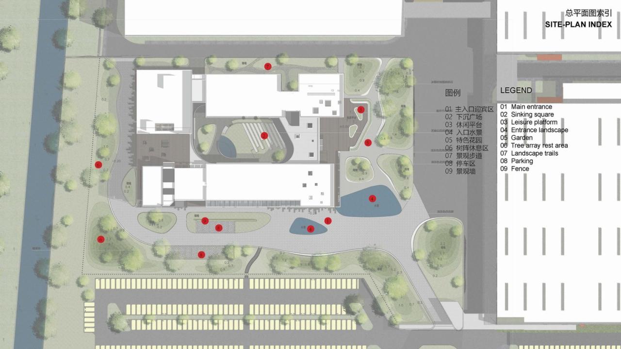 室外材料的色调延伸到生产厂房的外墙。垂直方向的渐变为水平体量提供了视觉韵律,同时与窗饰设计相融合。厂房内部采用大量天窗照明。生产线在几乎零粉尘的室内环境中运行。景观设计基于海绵城市的理念,借助自然雨水的地下渗透。大型水景和起伏的地面景观打破场地本身的单调感。建筑南侧种植了大量树木。随着时间的推移,这些树木将逐渐长大,为停车区提供遮阳,并为研发中心的主立面提供视觉缓冲。