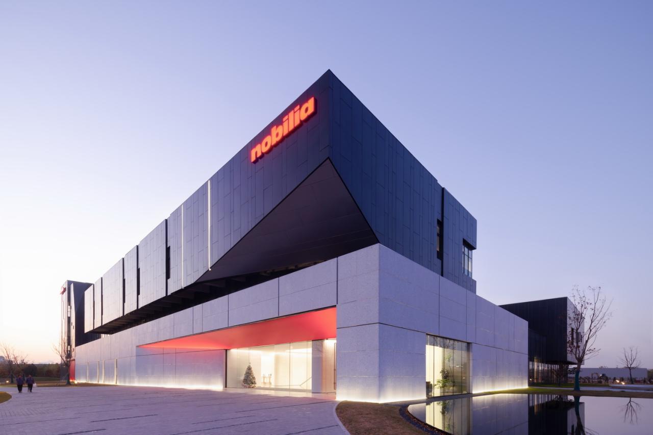 柏丽德禄亚太生产研发总部被设想为一个微型环境,承载研究、实验、管理、展览和产品发布等功能。从平面上,四个相互交错的矩形体量保护着一个长条形的庭院。从剖面上,底层的大型体量由人造石材勾勒而成,而玻璃幕墙覆盖的二层则是一个由锌板包裹的雕塑体量。建筑的外部造型深受德国跑车(如宝马 M1)棱角分明的线条的启发。内部花园是研发中心所有部门的中心聚会场所,花园也是一个非正式的室外舞台,设有阶梯式座位和中央舞台。所有三层办公空间都向内部花园开放,既能采光,又可借助阳台和露台通向中心空间。修长的庭院也让人联想到永恒的意大利都灵的菲亚特工厂。