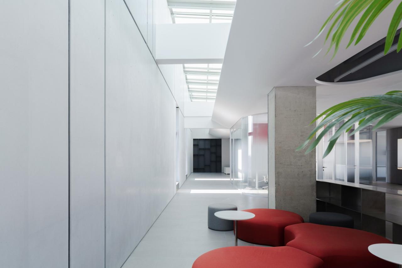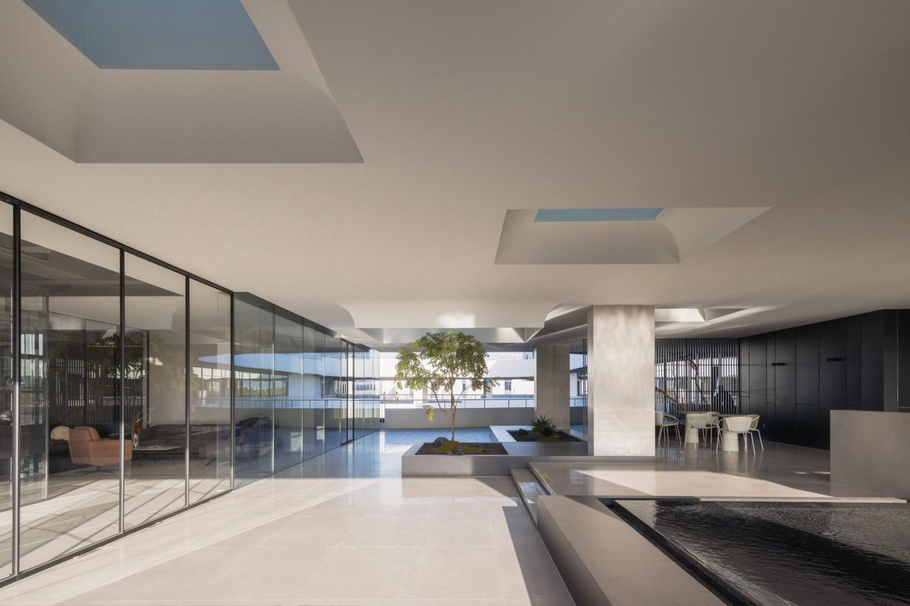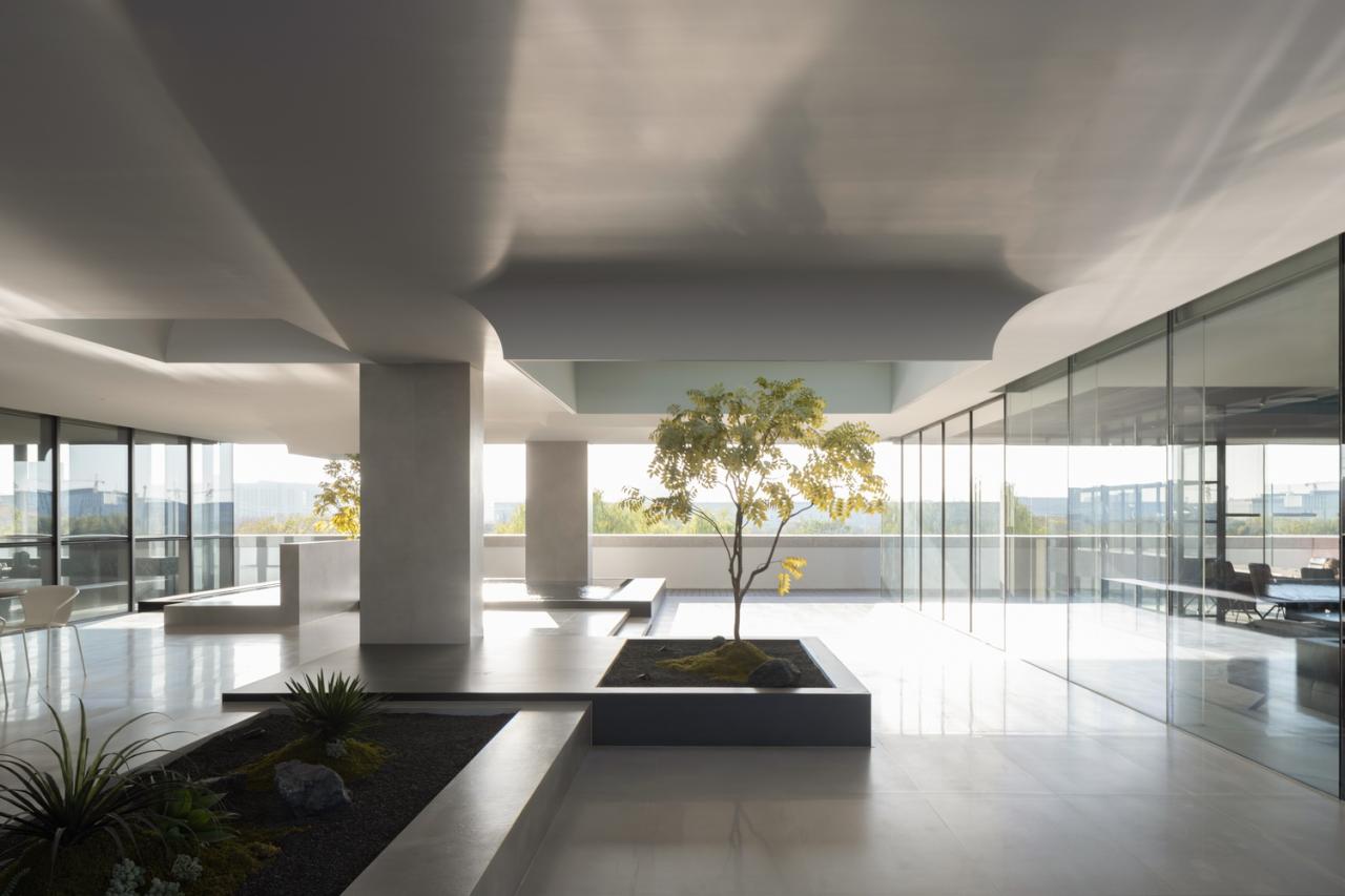 一楼的内部空间主要属性是公共的,包括主大厅、会议室、柏丽德禄的独立展厅、及与访客频繁互动的咖啡厅以员工空间。所有上述空间都可直接通往中央花园。二楼是管理办公空间和贵宾用餐及接待空间,这些空间相互贯穿,但又被一系列室外露台分隔开来。在这里,室内和室外空间的划分变得模糊起来。由于每个体量的尺寸较小,所有办公空间都能享受到自然光和交叉通风,营造出舒适节能的工作环境。三楼是研发中心,展示一些正在开发中的待发布产品。此外,三层还设有一个多功能阶梯式舞台,可举办演出、讲座、培训及其他集体活动。