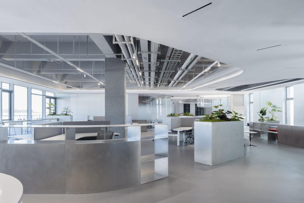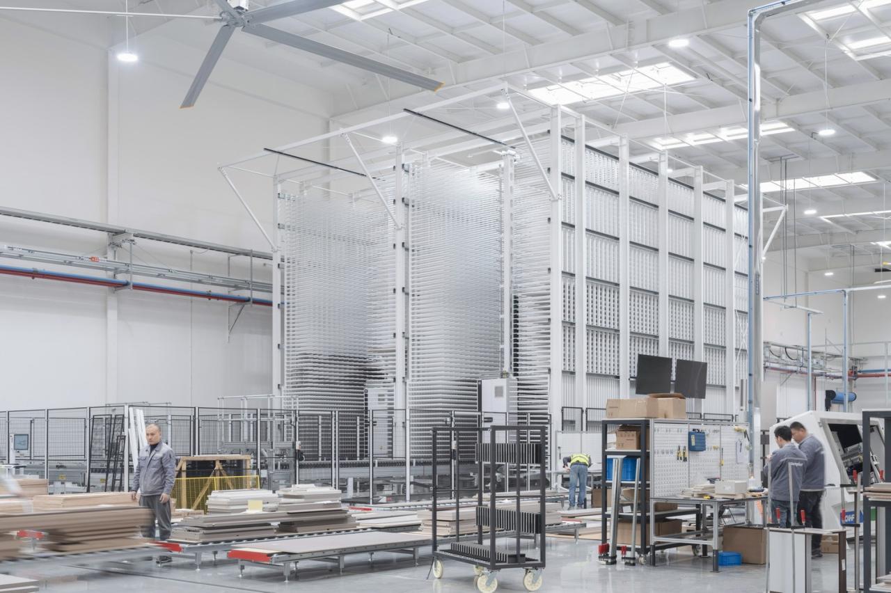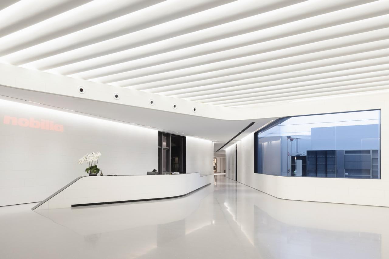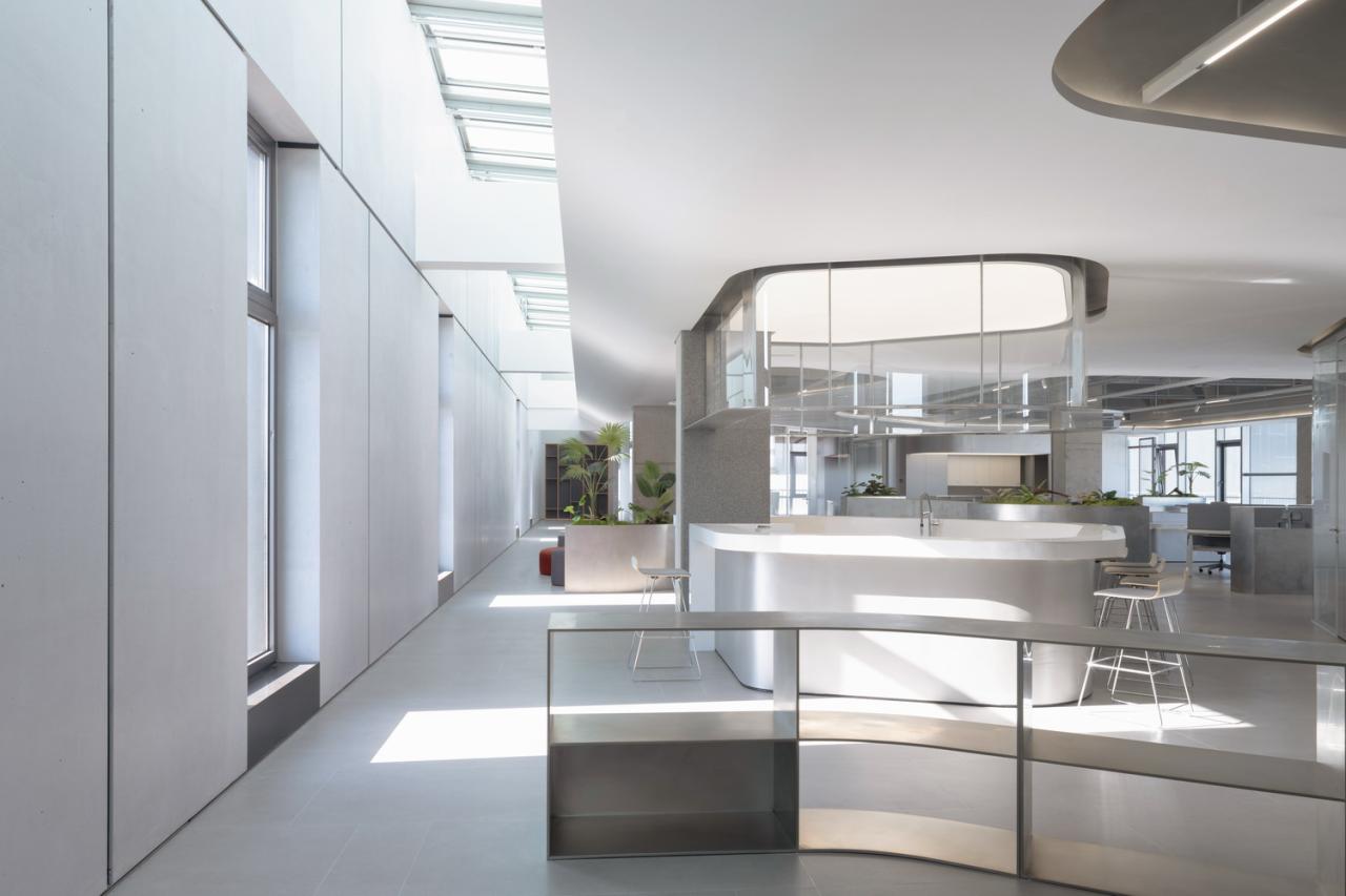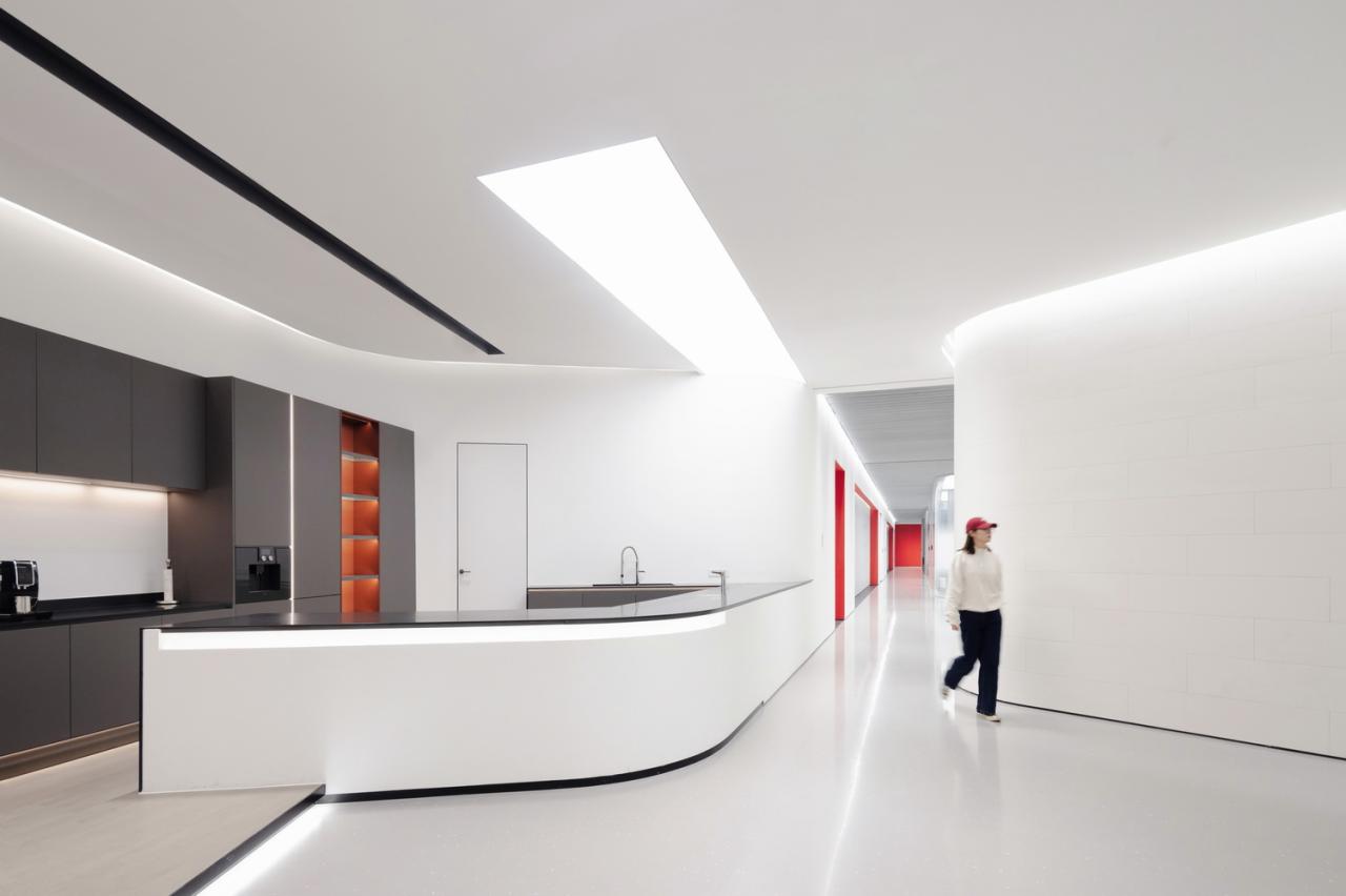 室内采用简洁的材料,公共区域铺设人造石地板,办公和研发空间铺设地毯,便于未来灵活布置。大部分垂直表面采用金属、石材和玻璃材料,天花板保持干净裸露,以创造高度和空间灵活性。所有的室内隔断、滑动门、嵌入式橱柜都采用的是柏丽和德禄自己的产品。我们的想法便是,研发中心的内部工作空间同时也是一个 “现场展示厅”,员工们在自己设计和生产的产品间穿梭。