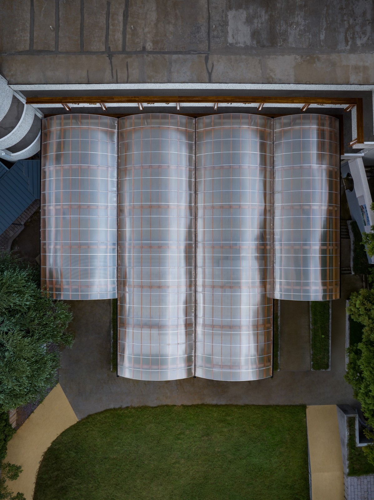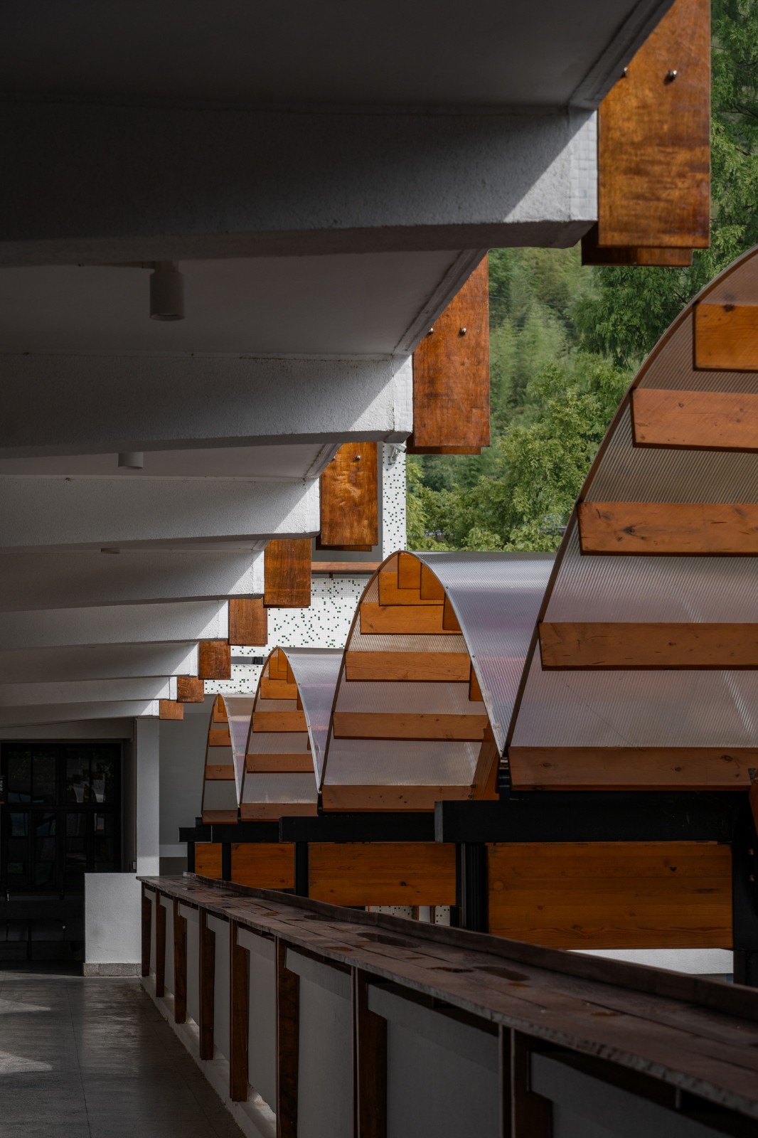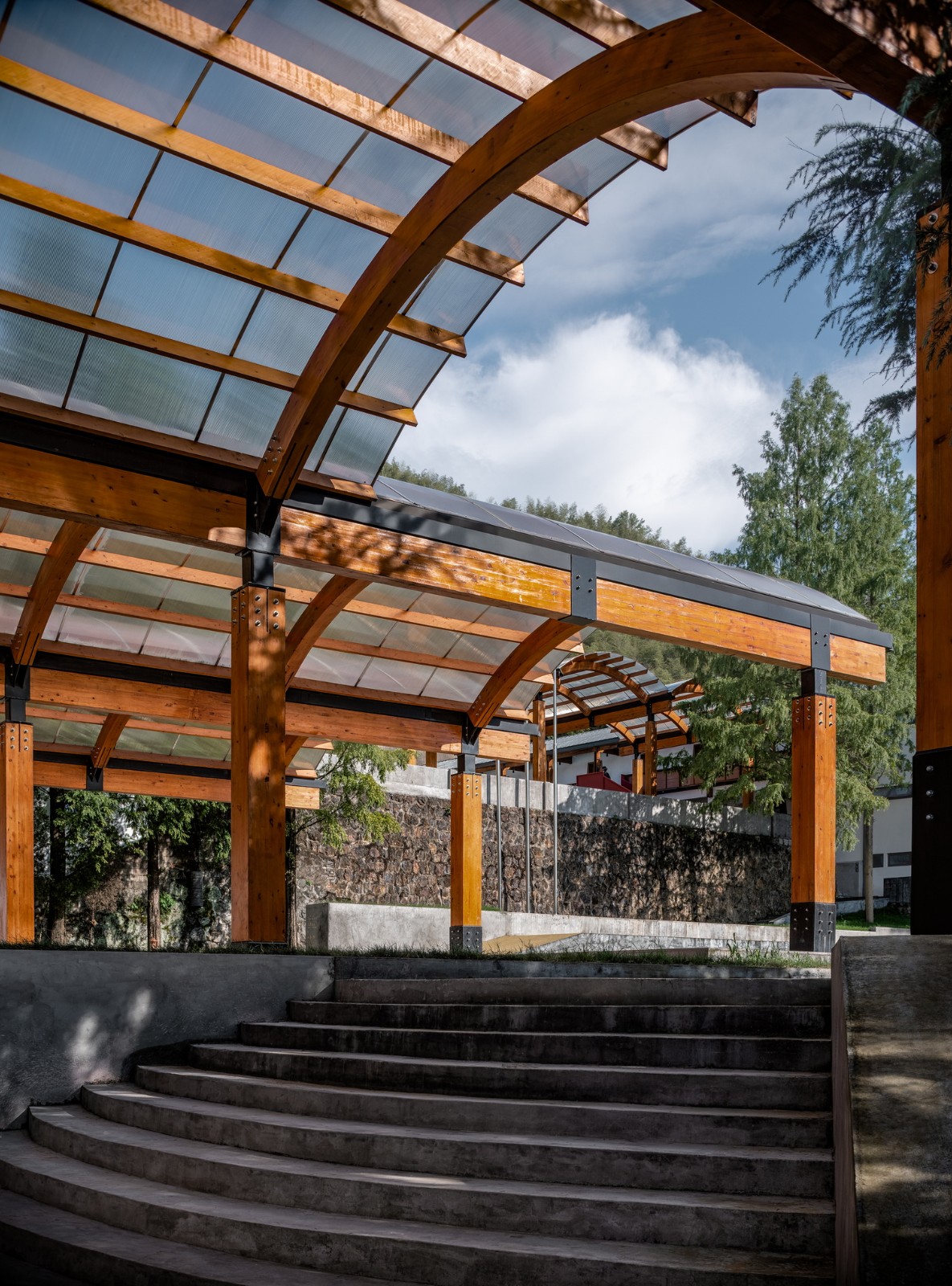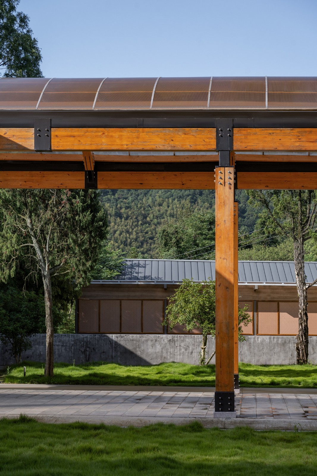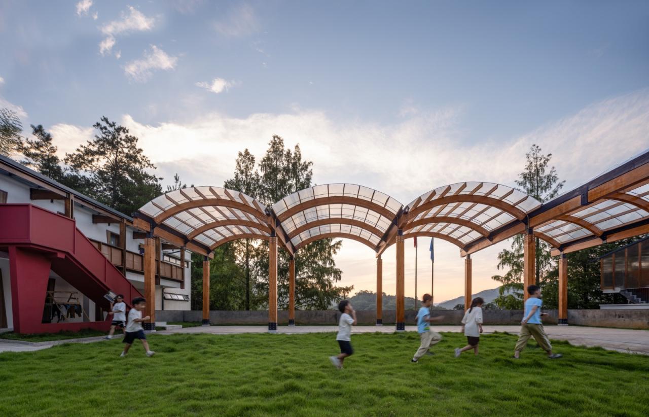 在青山与乡村的环抱下,孩子们一定是主要在户外玩耍的,但原址中又缺乏可以遮阳避雨的半室外场地。因此“一顶乡村大棚”的概念被我们继续借用,以解决问题。和以往的实践不同,这次是一座胶合木构与PC阳光板的透明卷棚。一是想它尽可能的轻盈活跃、赏心悦目,从具有沧桑沉淀感的原主体建筑群中脱离出来, 形成自己的话语。二是充当建筑与操场之间的空间传递者,让老师与孩子得以在棚下开展多种教学互动模式。三是这个类型来自于乡村最常见的农用大棚,其最主要的特点就是充满阳光,却不至于过分曝露,毕竟那棚子上的阳光雨露,及其透射出的青山绿水,是乡村能给于城市孩童最重要的礼物。