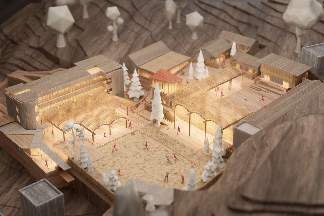 最终整个建筑群形成具有明显疏密对比的空间关系:每一组建筑都紧凑黏连,并且都附带一个较大的开放场所,其间由趣味多样的台阶与坡道过渡。