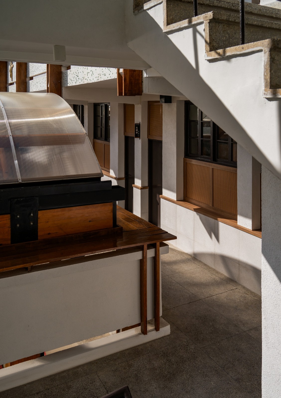 再根据这个列表,推进每一栋建筑的改造方案。比如1号主体教学楼,从功能与安全角度考虑,我们仅对屋顶、卫生间、局部门窗等进行了修改,并将其中一个教室改为主入口,通过一个楔形走廊,联通场地内外。但原立面马赛克砖、地面铺地、校训标语、所有室内黑板,以及走廊门窗等,都维持了原状。