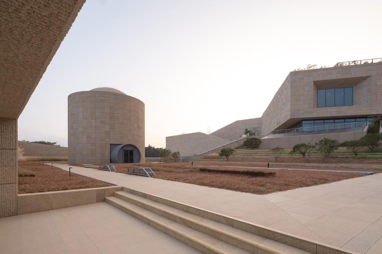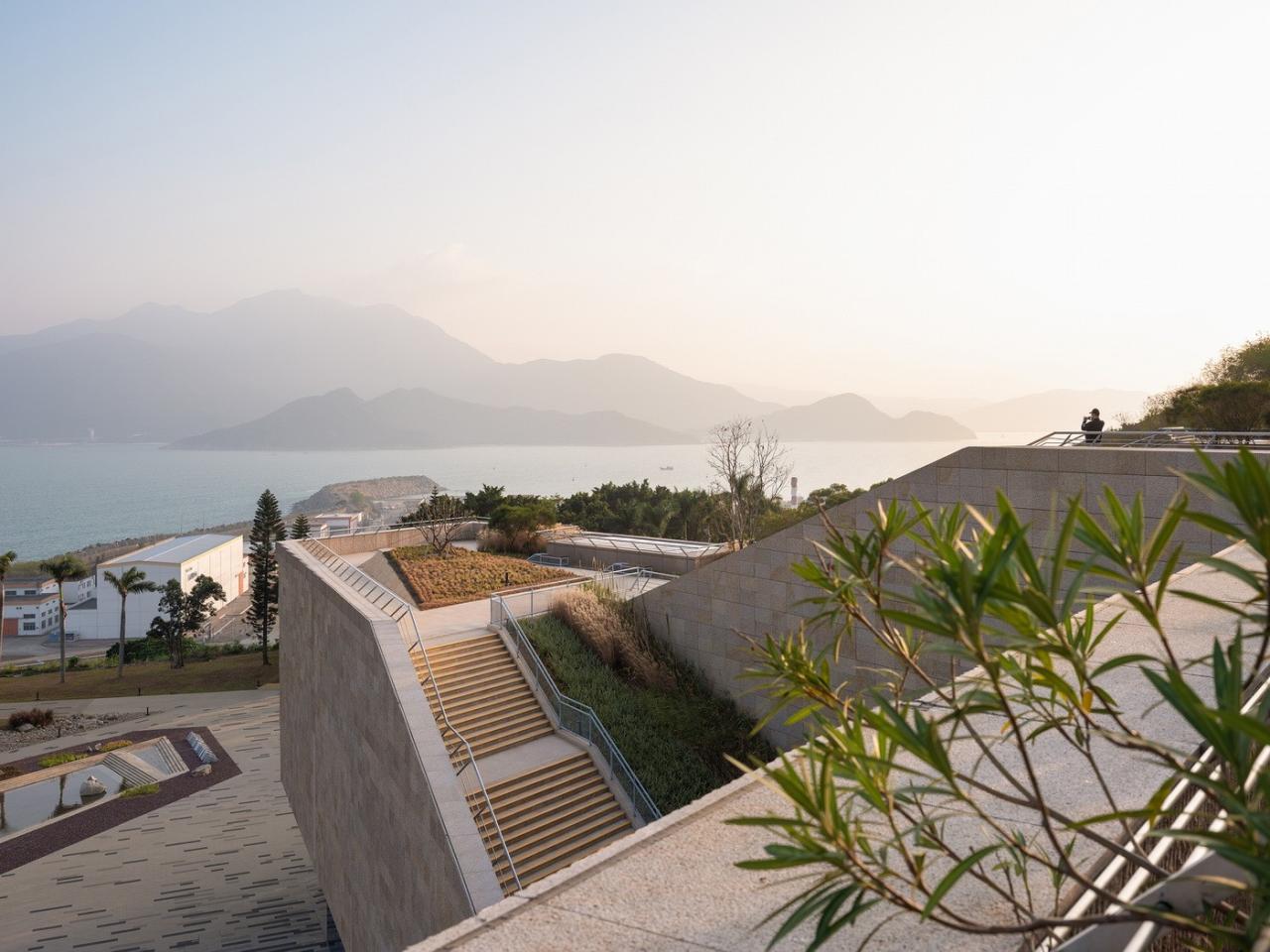 融入自然入口广场海天一色,仿佛一个考古发掘的现场,以现场开挖的粗粝天然石材为主要景观,一株保留的大榕树位于广场中央, 诉说着四十年的记忆。屋顶结合室外展览路线,步移景异,融入自然,成为公共登山绿道。