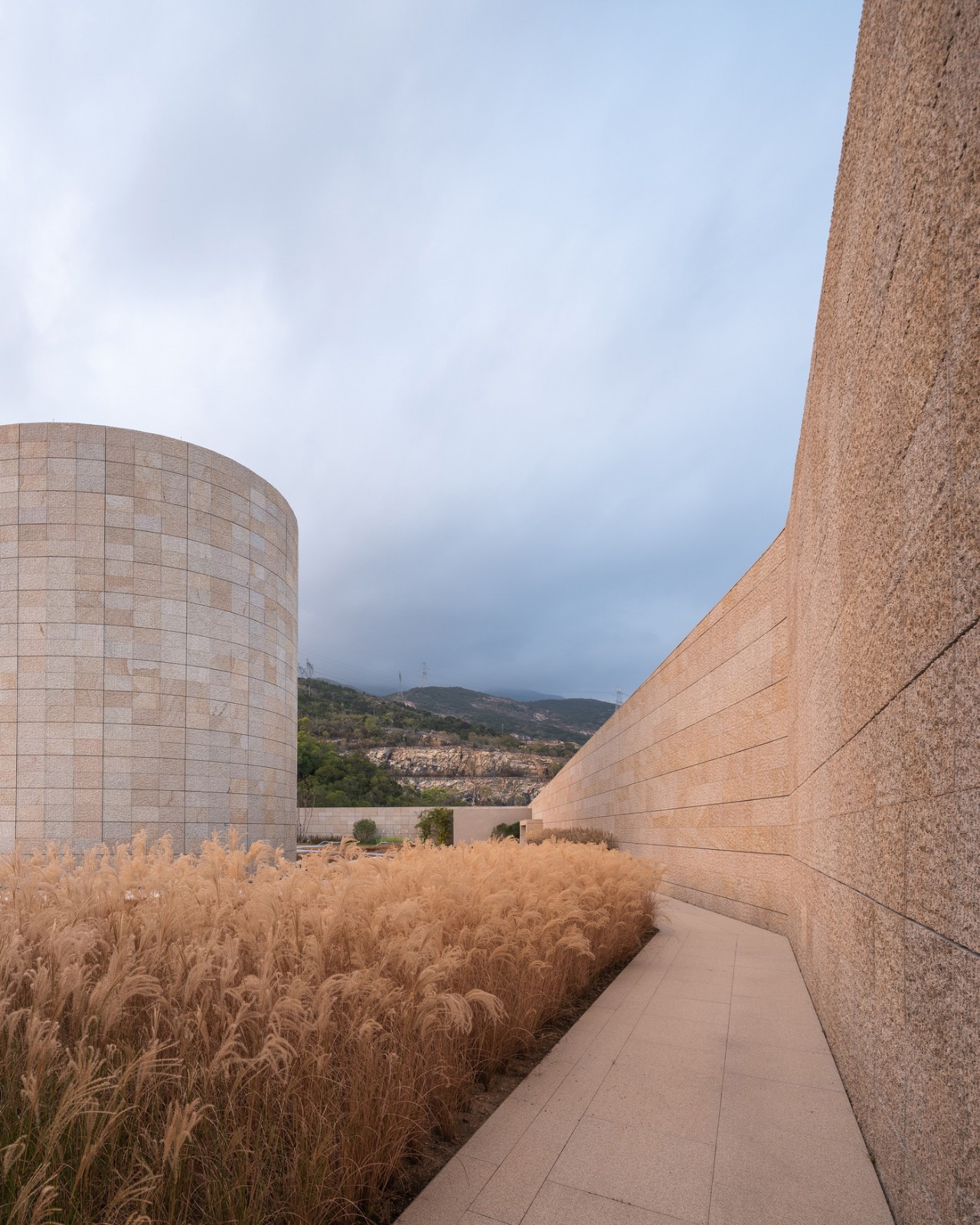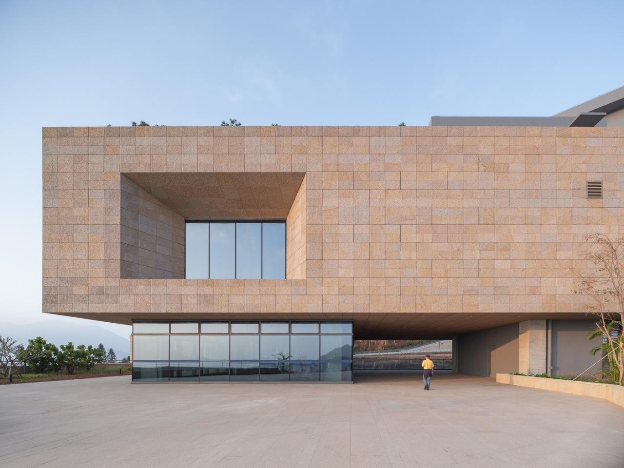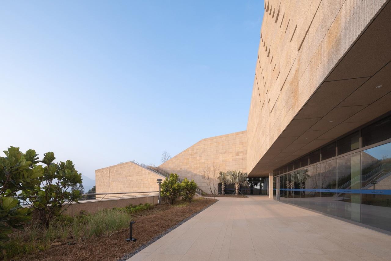 山体重塑科技馆位于核电基地中心高点,建筑后退,融入山体,仿佛剧场的看台,可以全景俯瞰核电基地的全部六台机组。建筑体形厚重。几何形状硬朗刚劲,表达出核安全的持久永恒,也抵御台风的侵袭。建筑外立面采用本地花岗岩色调,加以斧劈竖纹肌理,与裸露的山岩开采遗迹相呼应。