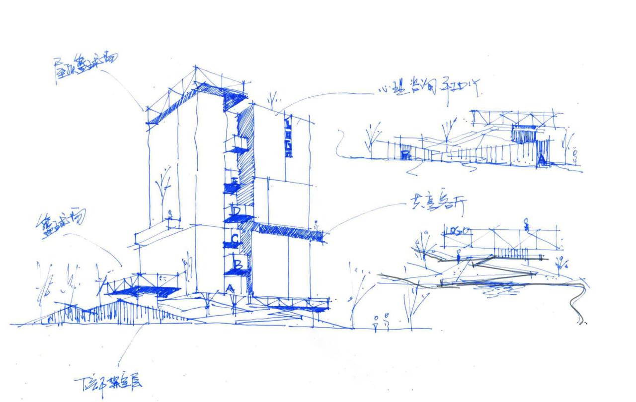 作为开放的景观空间与城市地标崇尚人文精神和场所营造,是未来城市空间设计的核心。建筑需要通过对场所的设计来展示其与场地之间在人文气度上的一脉相连:表达青年广场对于北仑的独一无二,同时也反应北仑城市文化对青年广场不可或缺的影响。建筑主入口面向城市打开,使用者经由一条两层通高的架空廊道到达公寓门厅及其他功能空间。在满足实用性的同时带来满满仪式感。在景观利用与塑造上,将公寓底部架空,形态设计为层层叠落的台地,铺设草坡和台阶,以立体的方式向东南侧河流景观和西北侧城市界面自然垂落,为公寓的使用者提供观景面的同时,又为城市提供趣味性的景观,形成可渗透、可步入、可使用的公共空间。