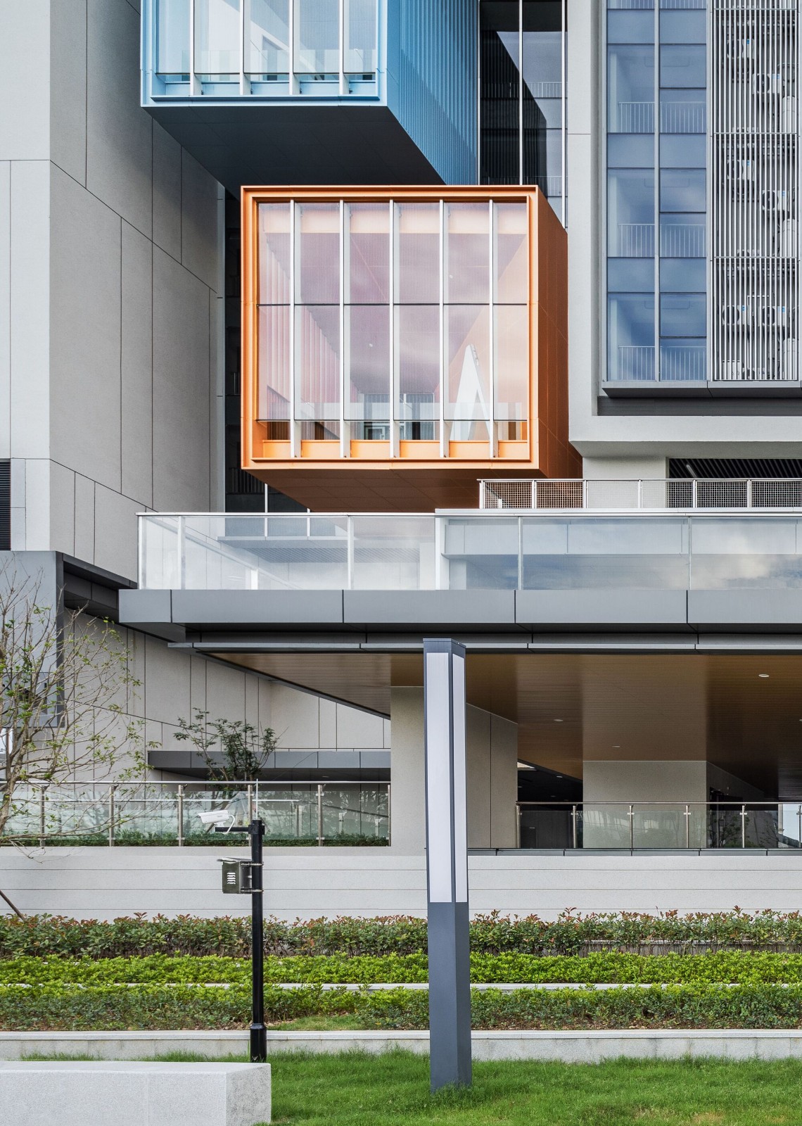 在城市界面,建筑以一种活力积极的姿态面向城市。精致错落的建筑形体犹如跳动的音符,像青年一样向北仑展现自己的热情与活力。在延续城市文脉的努力中,设计师以北仑本地特色为基础,辅以北仑海洋文化和海港文化,通过形体变化与对比彰显青年的特色,形成兼具地方文化与时代特色的建筑立面,与西北侧千篇一律的城市界面形成对比,也赋予建筑具有标示性的外观。起伏变化的曲面意向取自北仑海岸的汹涌波涛,承载北仑青年远航的未来;集装箱造型的“共享盒子”由低到高密度逐渐变小,象征着北仑青年远方的征途;多彩的颜色与多变的空间则代表着北仑青年的朝气蓬勃。