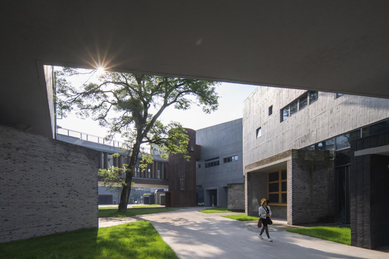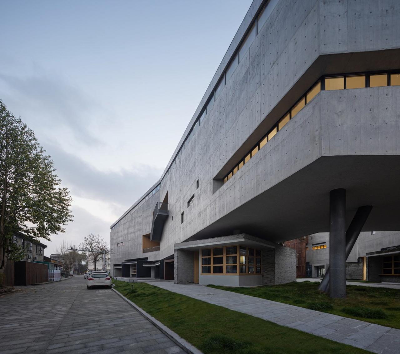 其二,艺术中心的首层,来源于对场地周边空间肌理的重组,使得场地与周边街巷贯通连续。多个民居尺度的商业体量,通过旋转、穿插、进退,与周边低矮的民宅围合出尺度适宜的街巷空间,使建筑形体由此在近人尺度上化整为零,延续场地记忆。