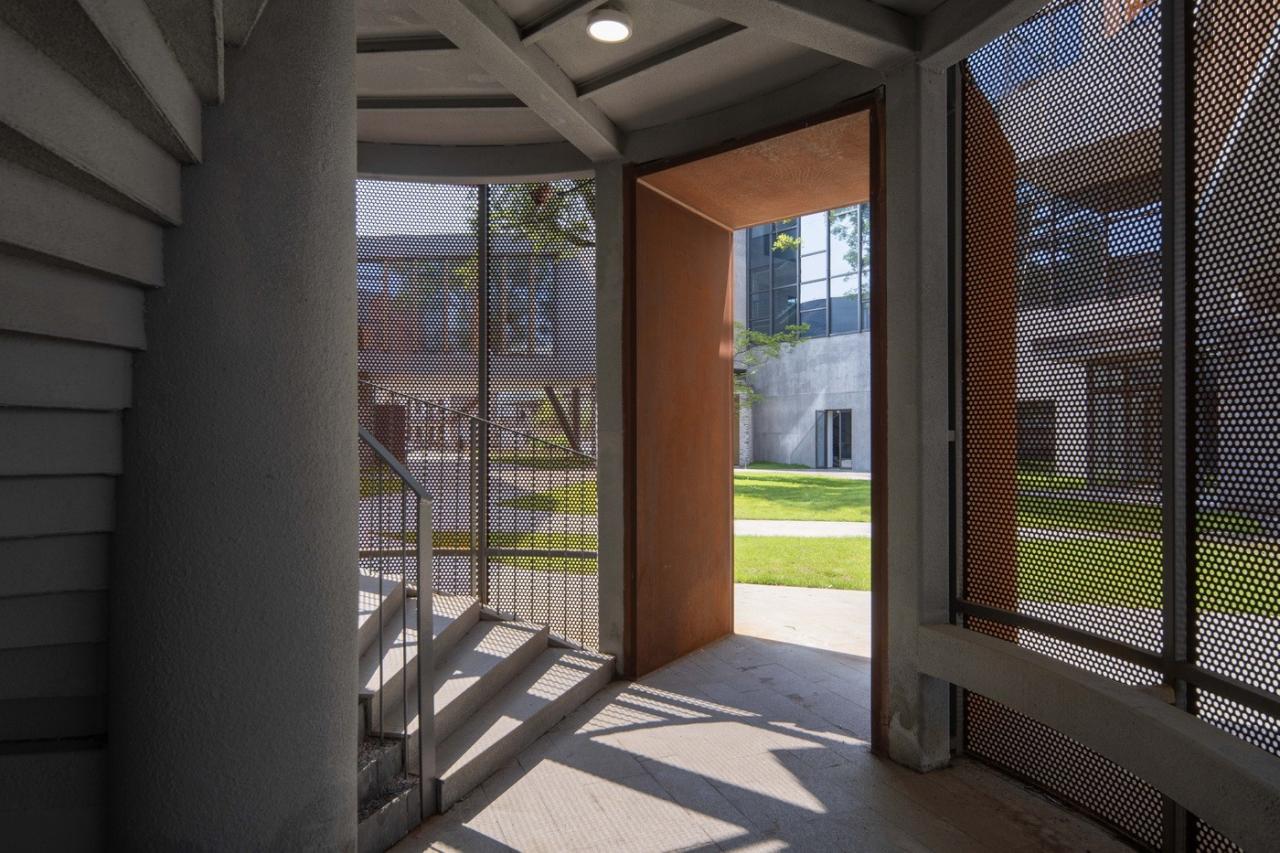 在整体为素色的展览空间室内,由与建筑相同的红色金属锈板楼梯为统领,贯穿其中,打破了通常封闭美术馆的白盒子印象,使得内外空间得以连贯,也丰富了内部空间的体验。