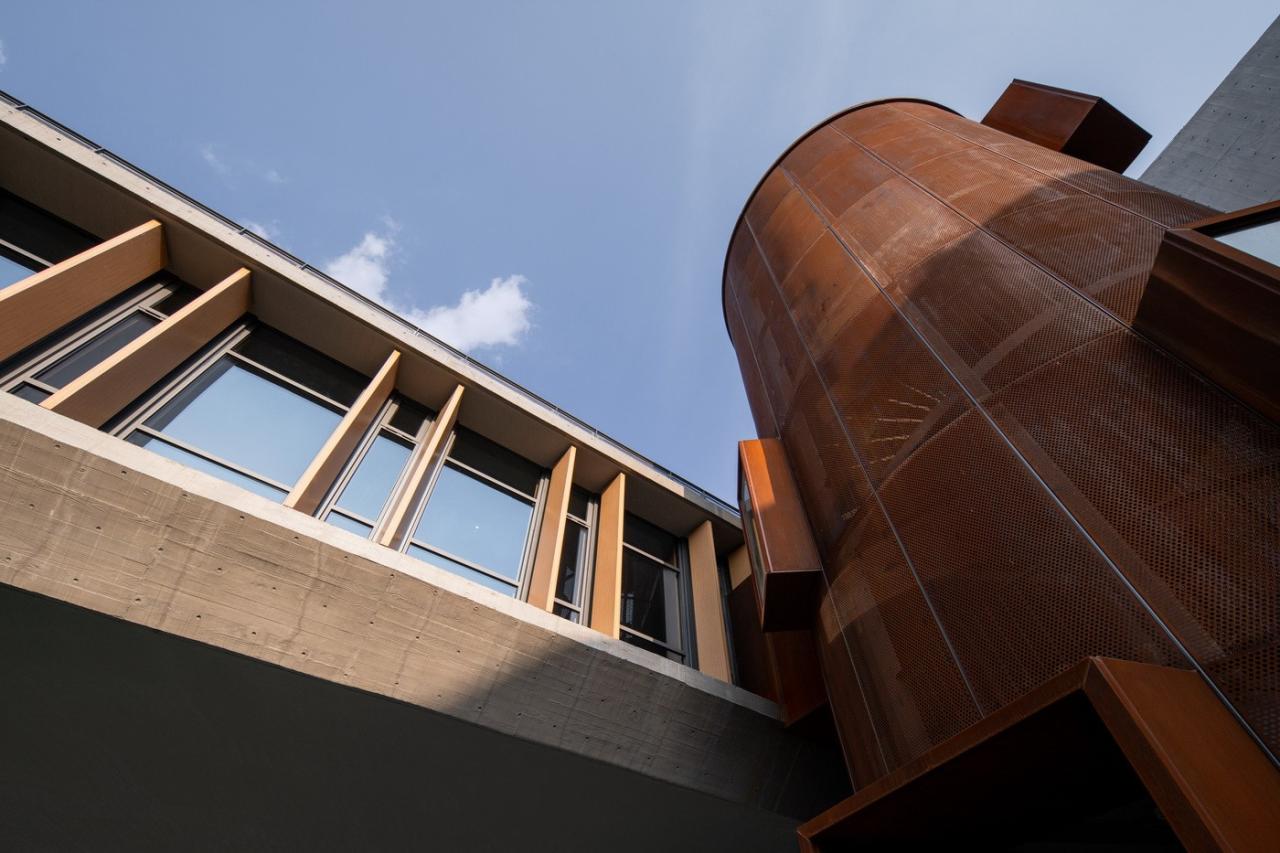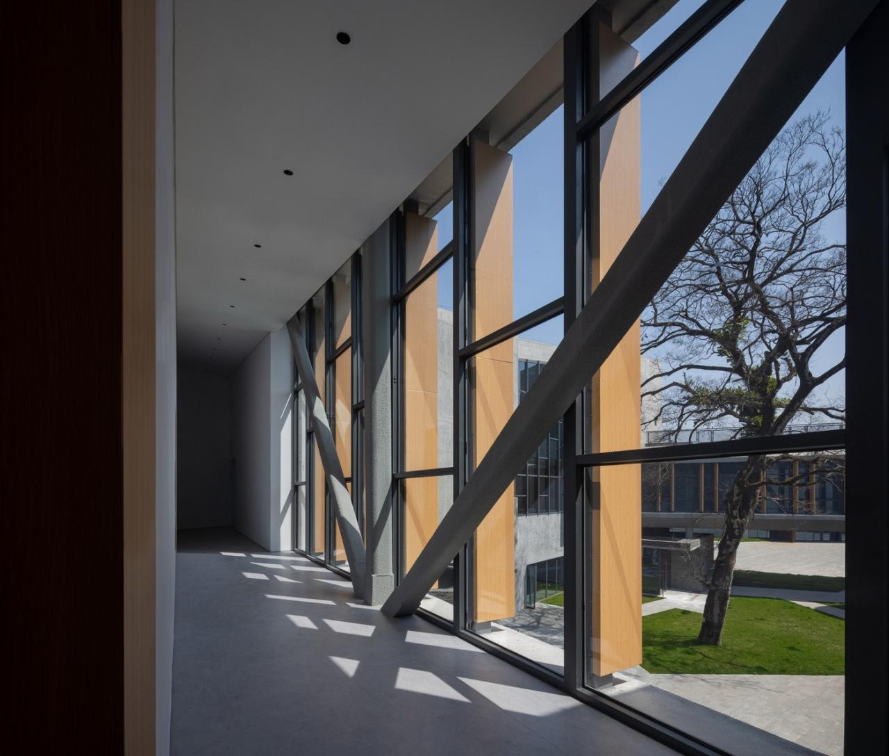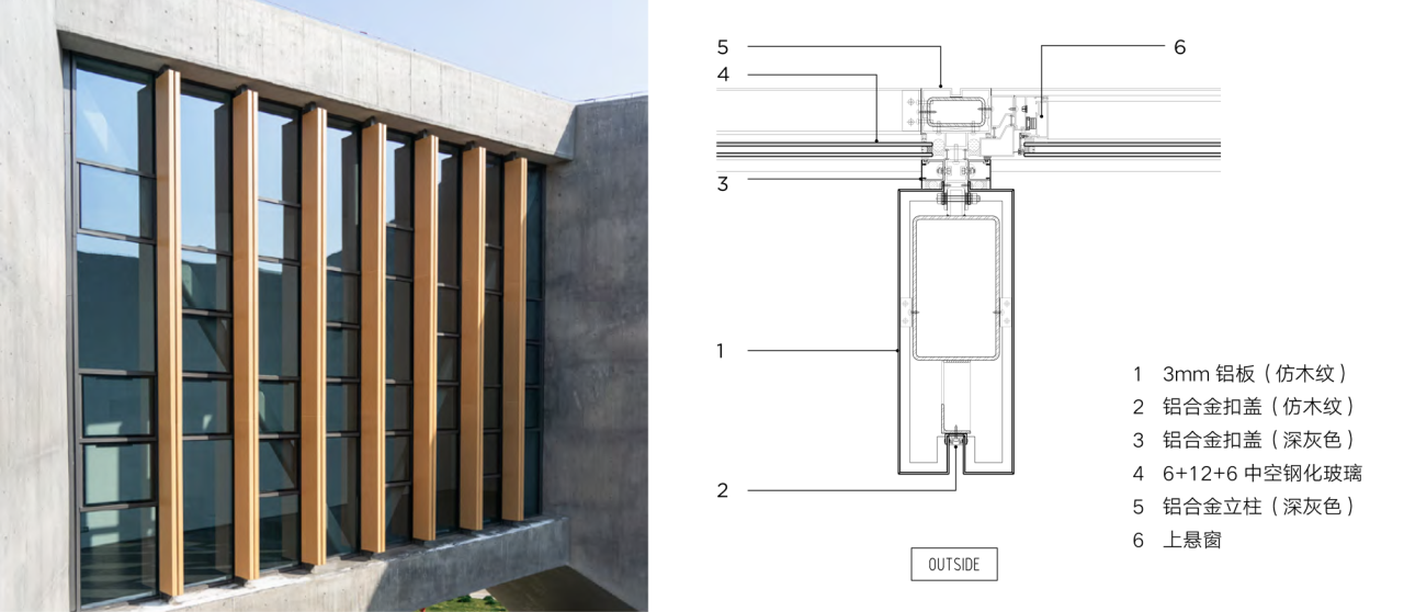 仿木纹铝板形成的竖向构件结合木模板混凝土,保持建筑力量感的同时,增加温润亲切的肌理质感,并在建筑内部形成丰富的光影关系。
