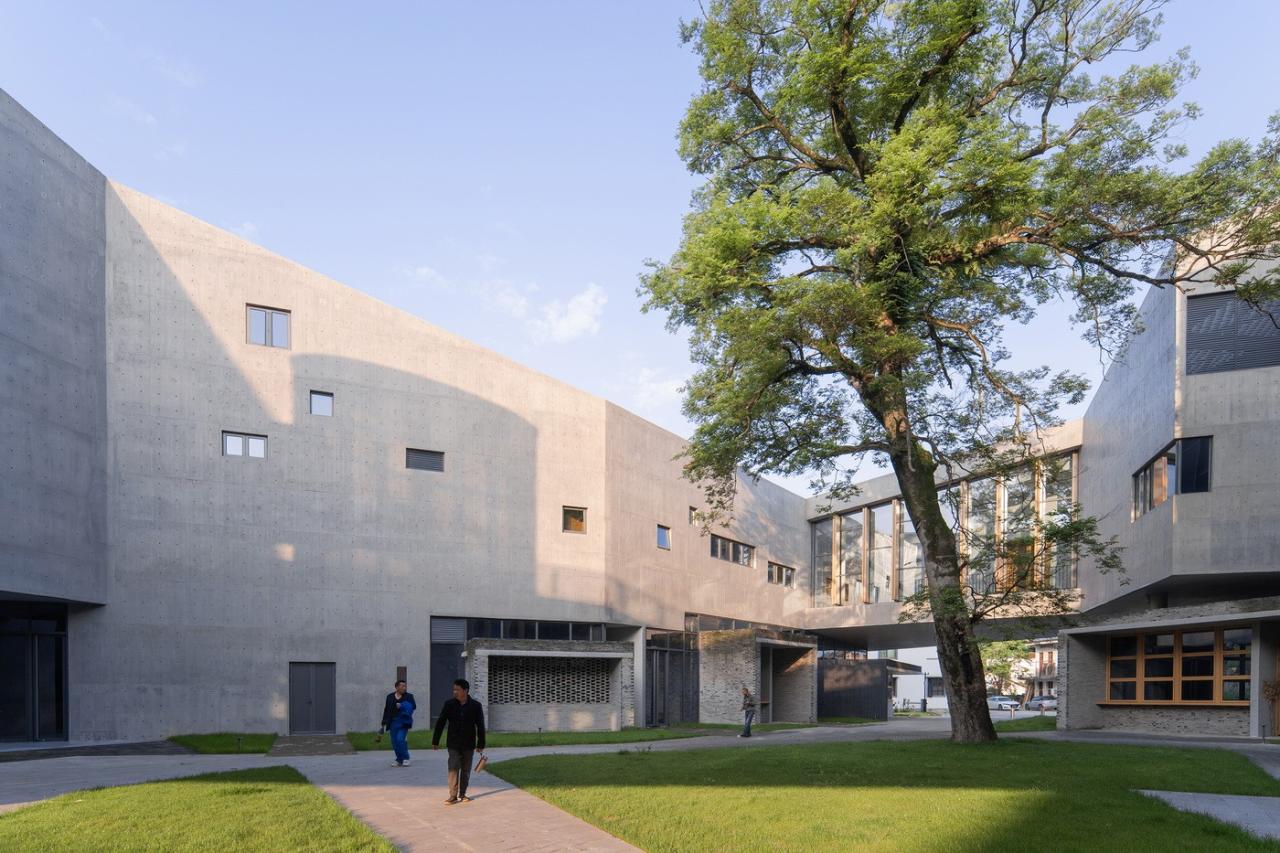 其三,围合的空间内部,在建筑二层设置架空的连廊,以此打破大空间的单一性。尺度不一的庭院广场丰富了艺术中心面向日常的公共属性:大广场提供小镇千人集会的场所;小庭院则以保留的百年古树为中心,延续乡镇中依附大树而存在的寻常公共空间。