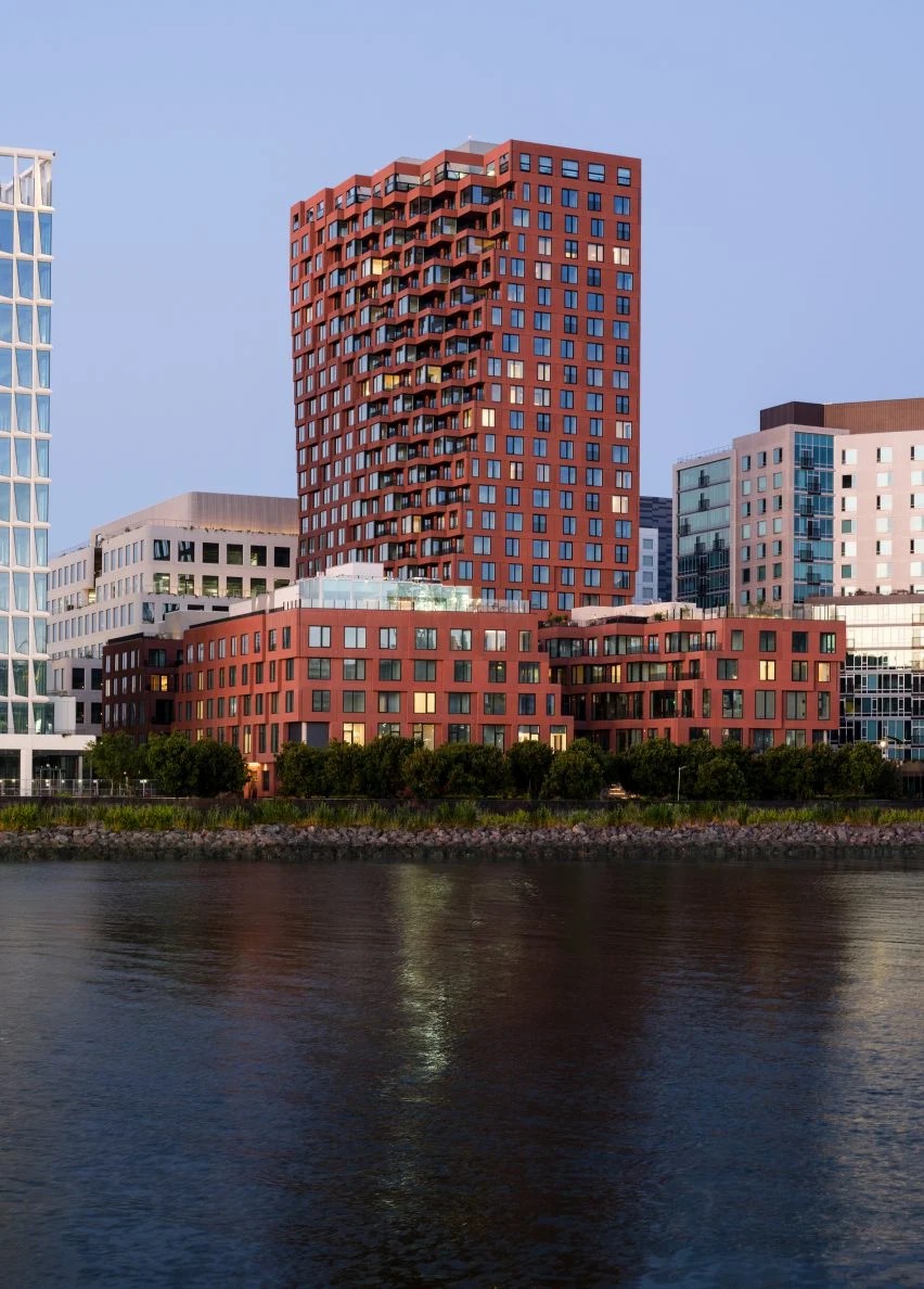 立面在中央走道相遇,窗户和阳台被退后,创造出崎岖的纹理。该建筑主要是住宅,包括283个住房单元,其中近三分之一留给“中等收入家庭”,一楼以上为两层办公室。通过对分的人行道为公寓提供充足的光线,这也将提供从街道到建筑中部和更广阔的Mission Rock综合体的通道。地面层设有许多可供公众使用的商店和餐馆,而景观和公共空间则被添加到基座结构的屋顶上。