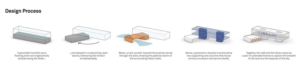 图书馆由底部坚实的基座和上层轻盈的玻璃盒子组成,两层体块沿着田野错落叠加,并旋转角度向田野敞开。一层设有咖啡厅和后勤空间,开敞的玻璃推拉门将访客的视线引向周边的田野景观。