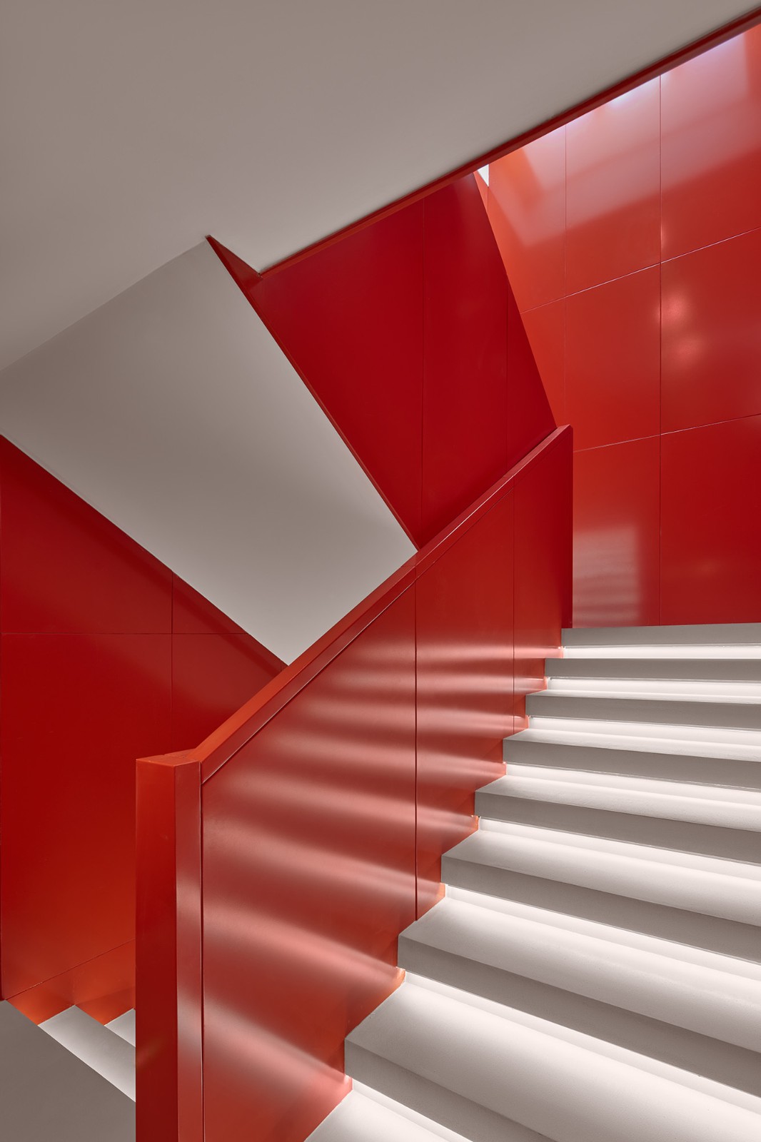 阅览室中央设有两侧开放的阅读角,可承载小型的读书会等活动。阅读角上方采用镜面不锈钢吊顶,将书架延伸至天花板上,反射营造无穷的垂直空间感。