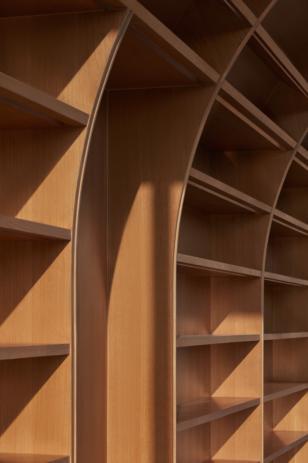 阅览室为营造无柱的开敞空间,巧妙地应用书架布局,将主体结构隐藏其中。宽阔的橡木书架蜿蜒向上,形成如树冠般的造型,营造乡村树荫下阅读、远眺旷野的经典场景。书架的每根“树枝”都嵌有一条线性灯,与2.2米宽的幕墙立柱相连接,形成连贯的线条节奏,营造出生长的树冠概念,打造韵律动人、错落有致的阅读空间。