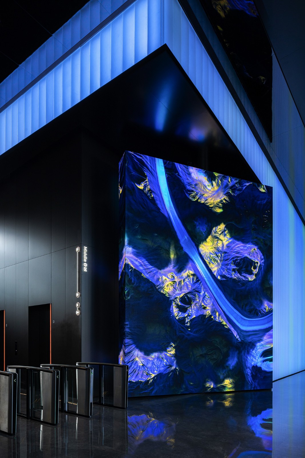 而在场地内部空间勾连外部的界面上,有着更艺术化、数字化的延展。大堂空间内的智能方块旋转幕和互动装置,是由中国台湾新媒体团队叁式Ultra Combo打造的永久性数字艺术作品“自然时诗”。