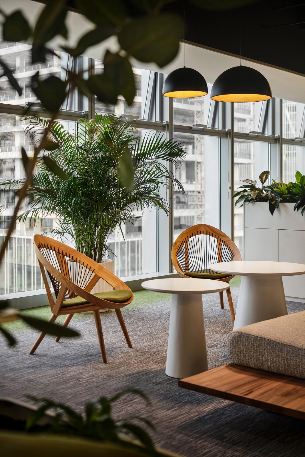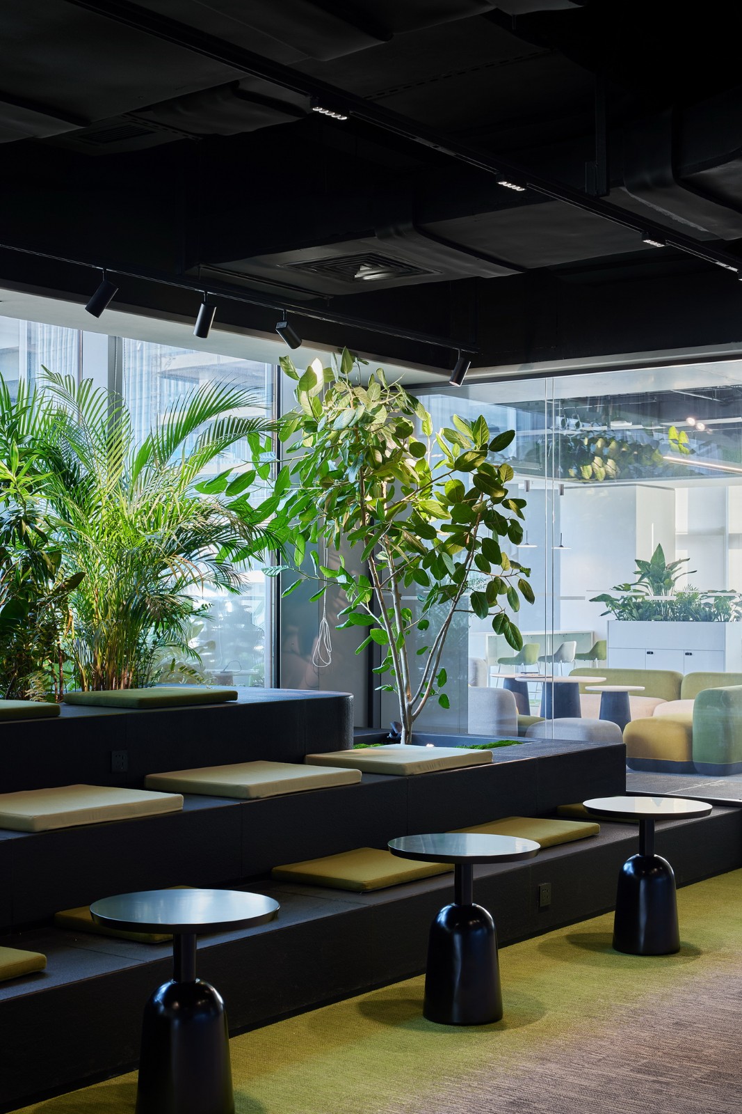 同时在室内部分,设计团队CCD巧妙地将绿色元素引入室内,通过创新的绿化布局,打造出一个绿意盎然的公共露台,有效弱化了室内与室外的边界感,使得人与自然之间的距离被进一步拉近,保证了公共空间与办公空间在绿意环绕中的舒展度。这处“云上”社交空间,给予惊喜的同时,激发人们感受环境、情感和生产力之间的紧密联系。绿色、活力、开放的办公氛围,藉由绿意延伸至室内,灵活的空间规划为人们提供了独立私密、共享开放类型环境的自由选择、随意切换,或是属于个人的沉浸式思考,或是在工作的间隙向户外的任意角落探索,又或是和团队在共享办公空间展开快速而专注的头脑风暴。