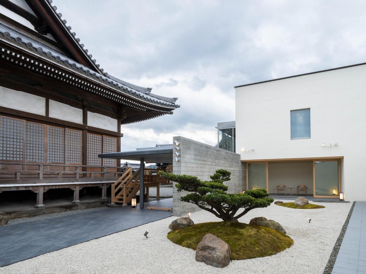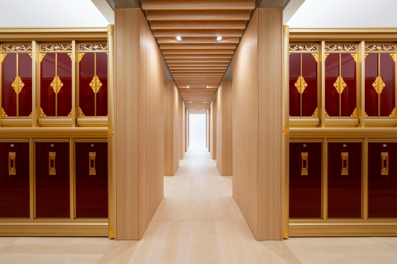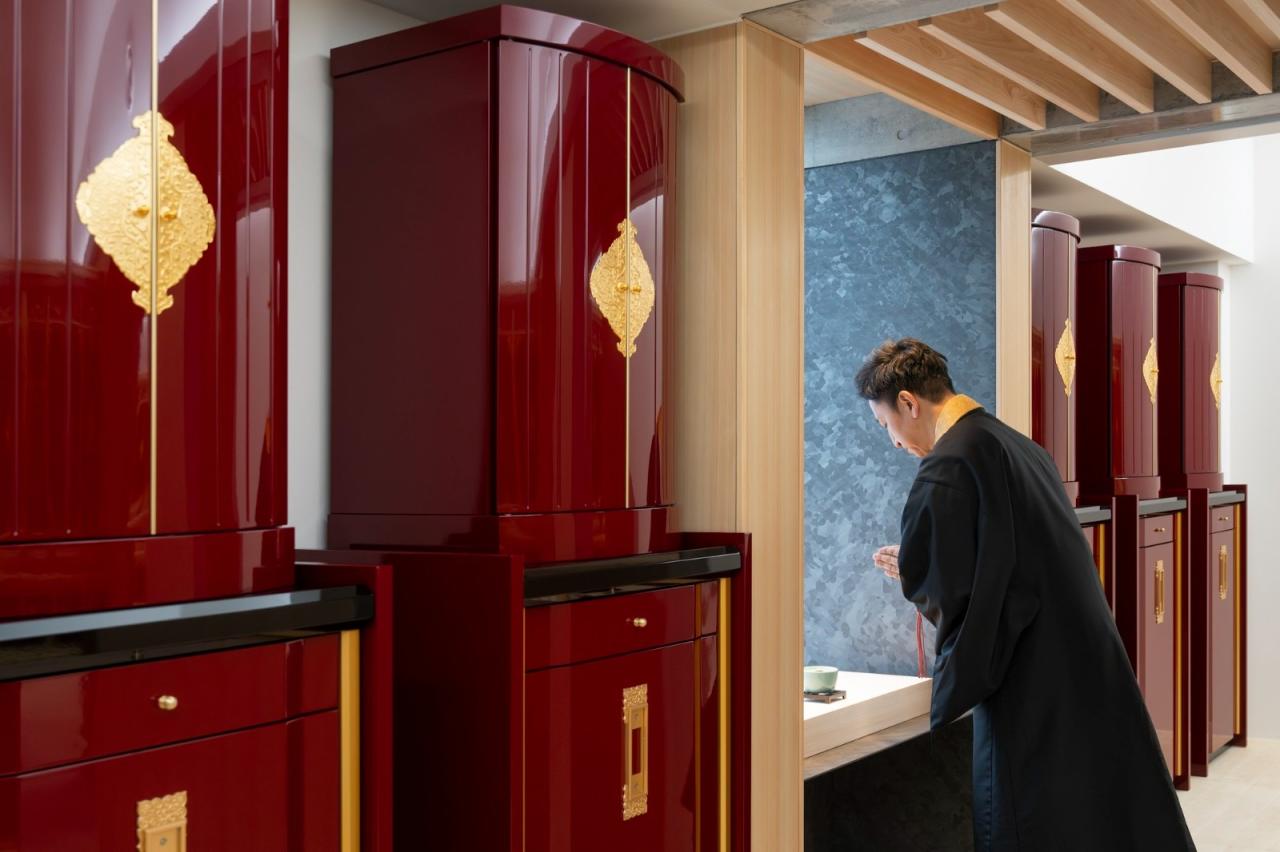 设计的一个显著特点是“寂静花园”,一个枯山水花园,以一棵松树和石头精心平衡的布局为特色。石头来自寺庙内部,加深了花园与场地传统的联系,而精心挑选的日本白松与地点完美地融合在一起。访客被邀请在半开放的空间舒适的躺椅上放松身心,眺望花园,沉浸在宁静的氛围中,怀念逝去的亲人。白色的石膏墙和广泛使用的木材在室内设计中占据重要地位,佛坛的颜色选择了深红色,而不是标准的黑色,唤起了西方净土的光芒和夕阳的色彩。