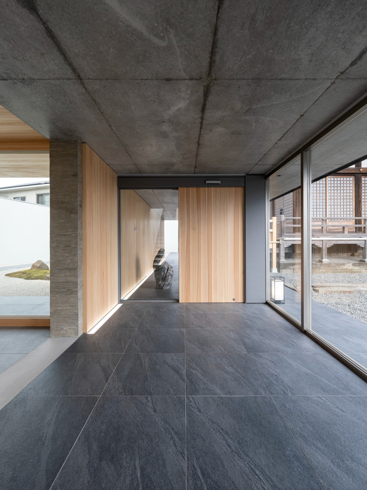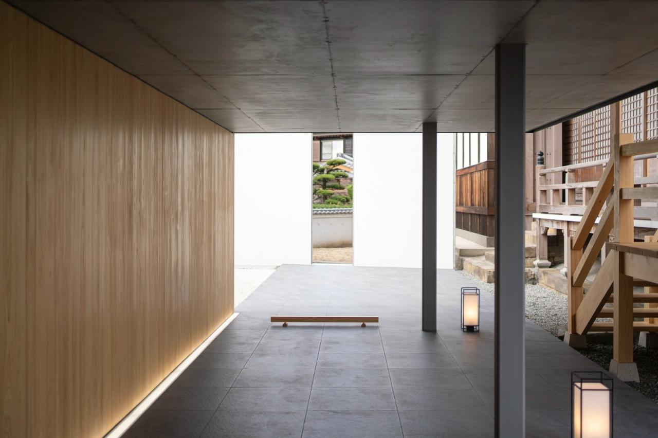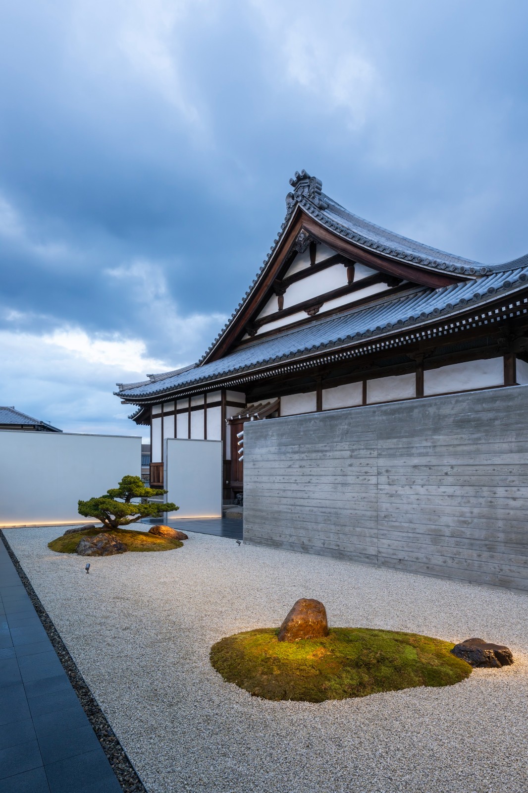 设计的一个显著特点是“寂静花园”,一个枯山水花园,以一棵松树和石头精心平衡的布局为特色。石头来自寺庙内部,加深了花园与场地传统的联系,而精心挑选的日本白松与地点完美地融合在一起。访客被邀请在半开放的空间舒适的躺椅上放松身心,眺望花园,沉浸在宁静的氛围中,怀念逝去的亲人。白色的石膏墙和广泛使用的木材在室内设计中占据重要地位,佛坛的颜色选择了深红色,而不是标准的黑色,唤起了西方净土的光芒和夕阳的色彩。