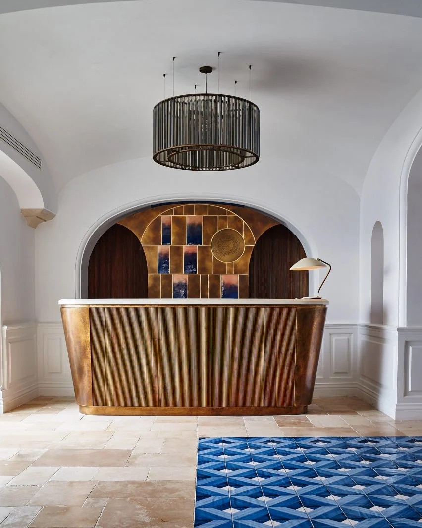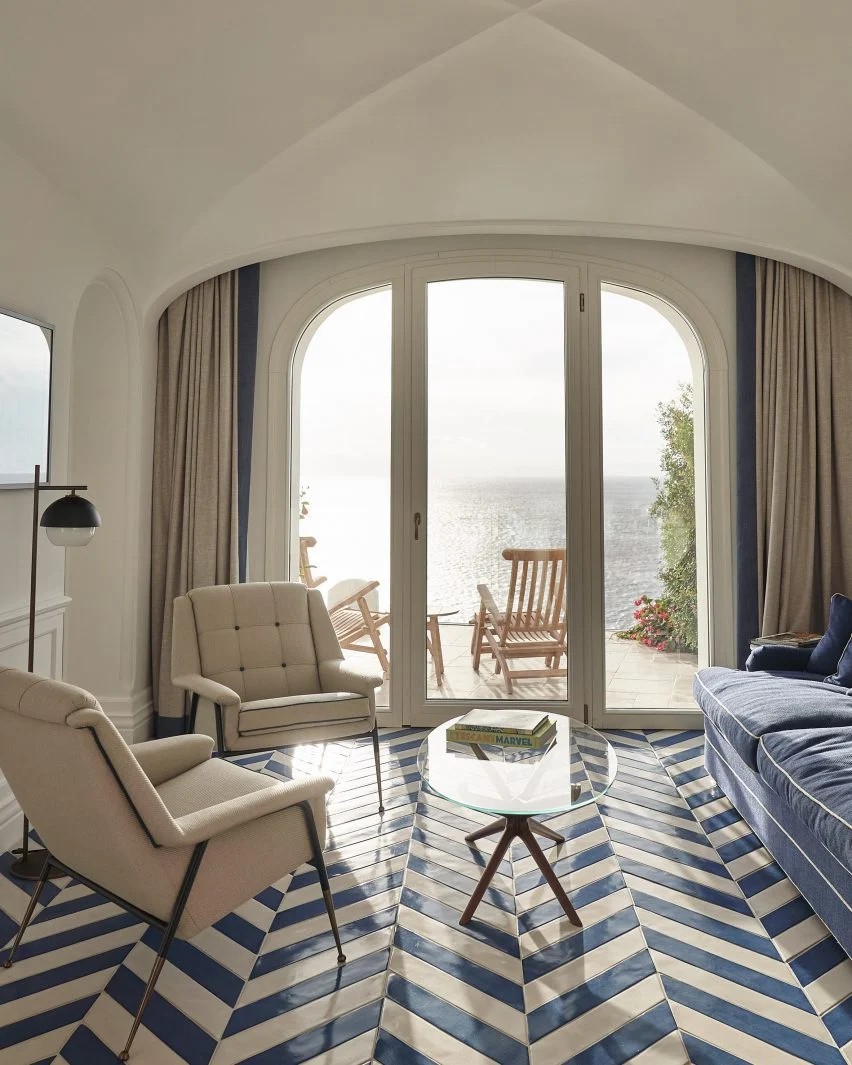 其中一些客房建在古老的石头城墙里,高大的拱形窗户和门勾勒出海洋的景色。许多房间都有蓝色和白色的瓷砖地板,与浴室相匹配,并决定了家具和床上用品的配色方案。根据酒店设计团队的说法,目的是“创造一个独特的环境,将中世纪的设计与地中海风格相结合”。早餐是在自然采光的阿利西(Alici)的拱形天花板下供应的,或在其广阔的毗邻露台上。另一个用餐选择是马里内拉餐厅(Marinella Restaurant),提供使用当地农产品制作的地区美食,以保留烹饪传统,还提供露天座位。一个名为“拉利布里亚”(La Libreria)的空间充满了深色的木制书柜,在白天充当图书馆,在夏季高峰期间用于私人活动。