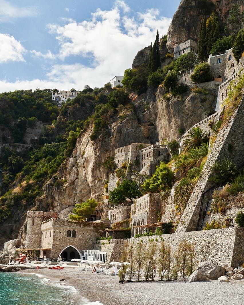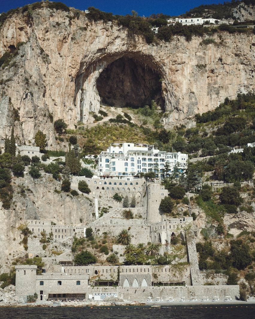 它坐落在一系列中世纪的石制防御塔和防御工事之上,客人可以穿过这些防御塔和防御工事到达酒店的私人海滩,在悬崖上雕刻的壮观的格罗塔-德洛-斯梅拉多(Grotta dello Smeraldo)喀斯特地貌下面。