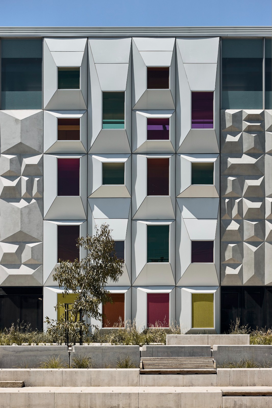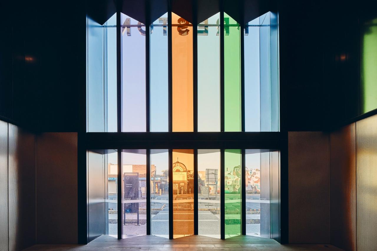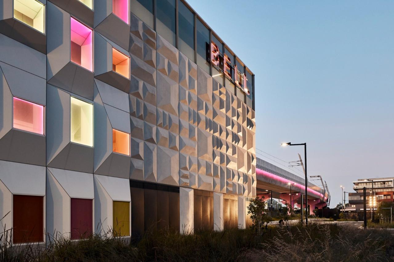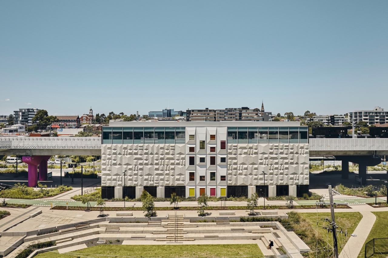 贝尔站的立面参考了周围列入文物保护名录的住房。 Darebin市的屋顶景观被抽象成了一个三维图案,形成了混凝土立面。 倾斜的图案使立面生动起来,其中包括能够将有色光线过滤到双层高的站厅空间的多彩玻璃窗户。 这些颜色取自照亮邻近的Darebin艺术与娱乐中心的色调,减少了站厅内人工光线的需求。 贝尔站的开发包括设计一个可作为洪水蓄水池的公共露天剧场。 与Darebin艺术与娱乐中心毗邻的这个双重用途的空间使现有的社区资产得以延伸到车站开发项目中。