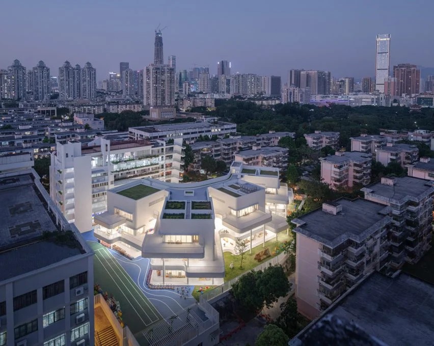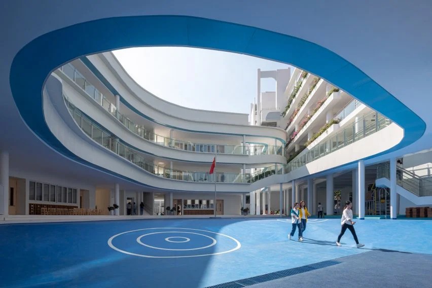 弯曲的阳台和户外学习空间是博物馆森林幼儿园(Kindergarten of Museum Forest)的特色,这是中国阿派朗建筑工作室(Atelier Apeiron)在深圳现有的幼儿园中添加的曲线建筑。为了挑战典型的幼儿园建筑,阿派朗建筑工作室设计了一个类似城镇的建筑,在其边缘添加了植物,形成了一个小森林。